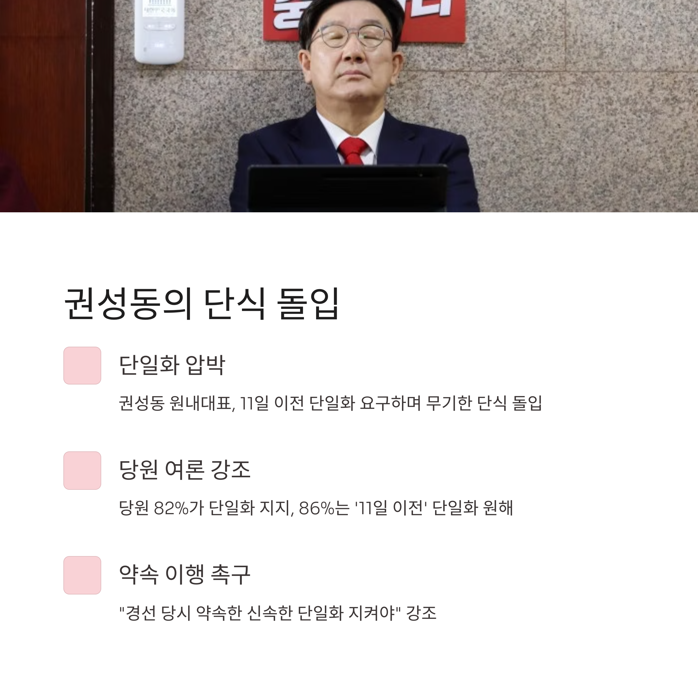 2025년 5월 9일, 국민의힘 권성동 원내대표는 당 대선후보 김문수에게 다시 한 번 11일 이전 단일화를 강력히 요구하며 무기한 단식에 돌입했습니다. 그는 “당원 82%가 단일화를 지지하고 있으며, 이 중 86%가 ‘11일 이전’ 단일화를 원한다”고 밝히며 김 후보의 결단을 압박했습니다.