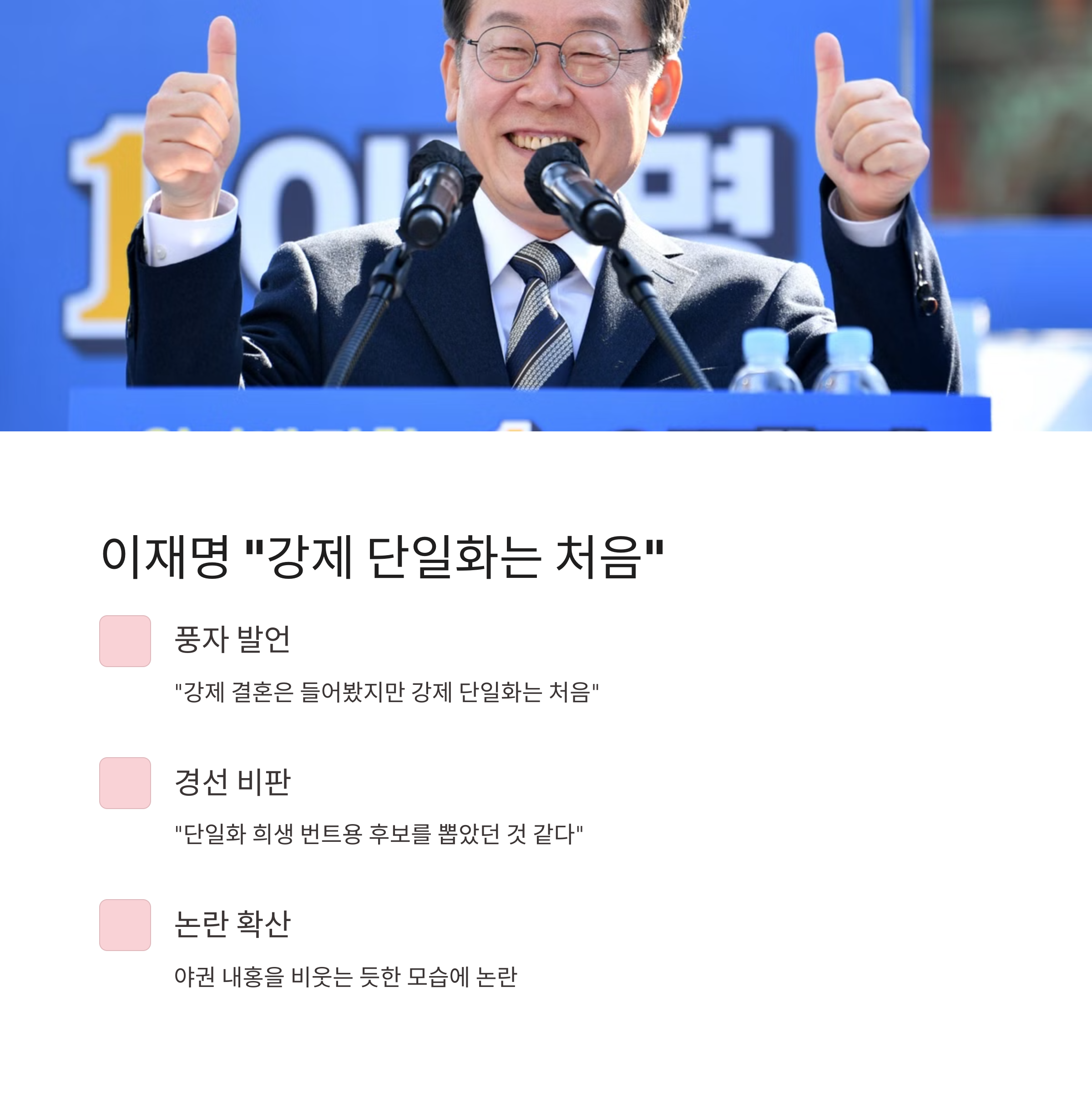 더불어민주당 이재명 대선 후보는 국민의힘 단일화 갈등에 대해 “강제 결혼은 들어봤지만 강제 단일화는 처음”이라며 실소를 터뜨렸습니다. “단일화 희생 번트용 후보를 뽑았던 것 같다”며 국민의힘 경선 과정에 대해 풍자하기도 했습니다.