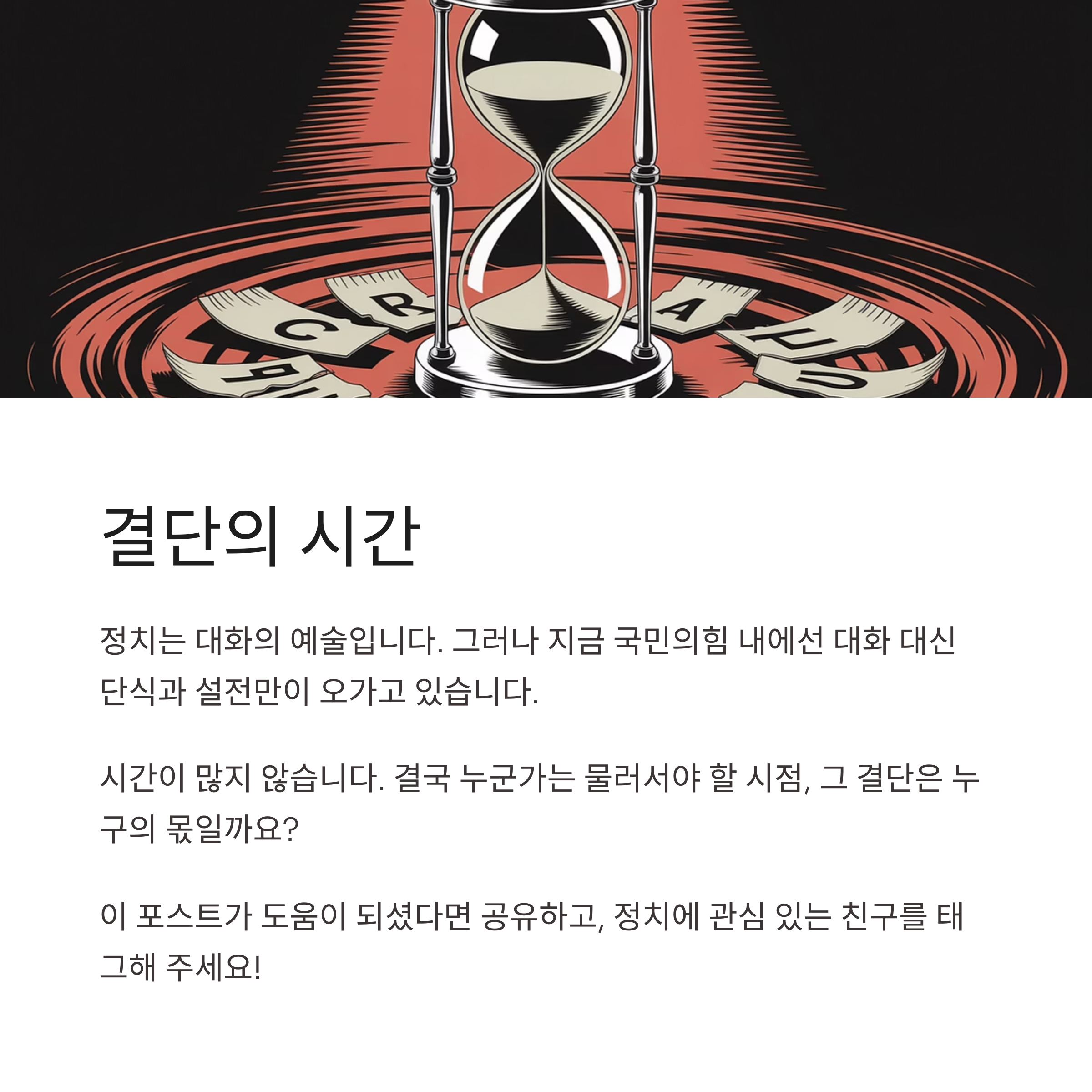 정치는 대화의 예술입니다. 그러나 지금 국민의힘 내에선 대화 대신 단식과 설전만이 오가고 있습니다. 시간이 많지 않습니다. 결국 누군가는 물러서야 할 시점, 그 결단은 누구의 몫일까요?