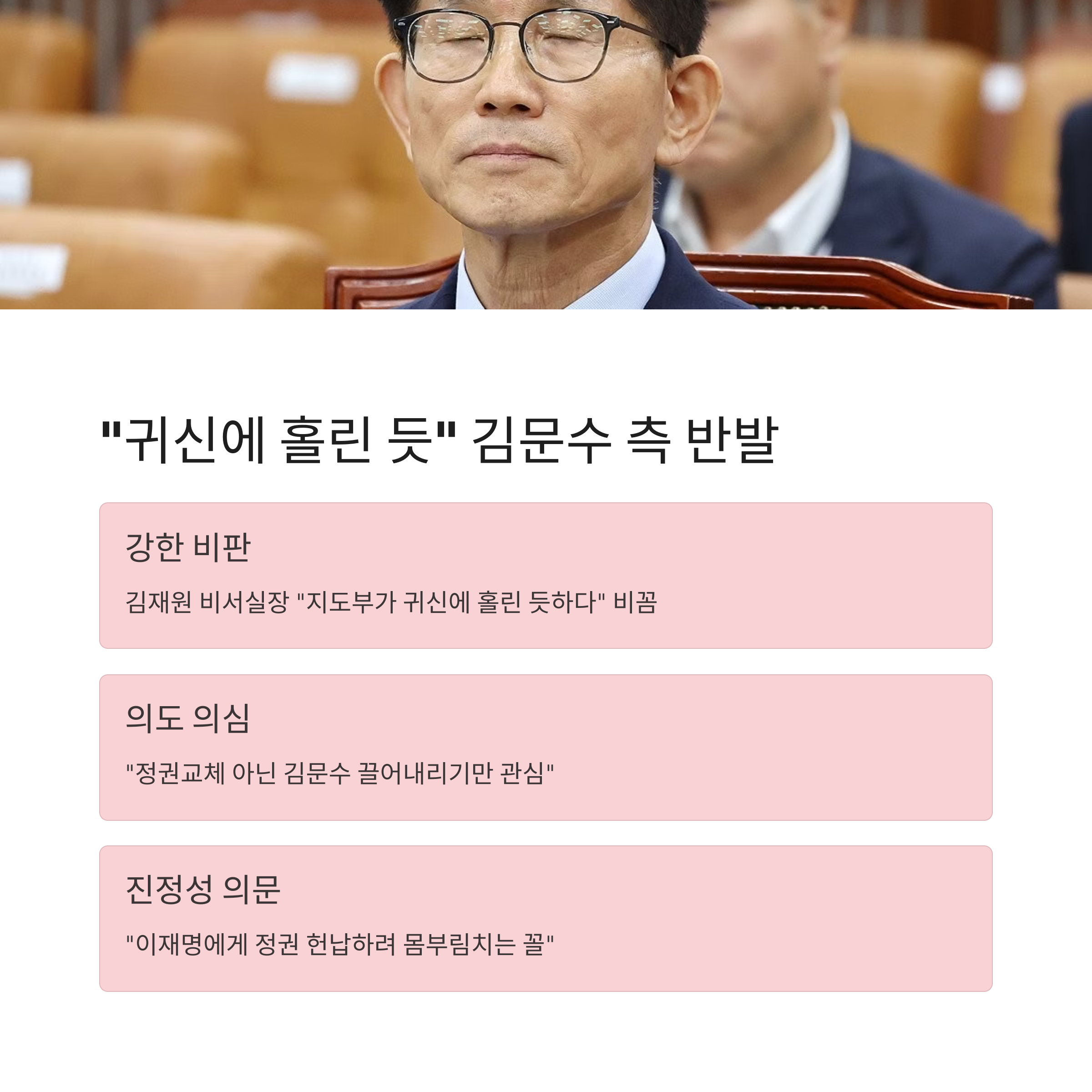 김문수 캠프 김재원 비서실장은 권 원내대표의 단식과 지도부의 강경 태도에 대해 “귀신에 홀린 듯하다”며 비꼬았습니다. 그는 KBS 라디오에 출연해 “지도부는 정권교체가 아닌 김문수 끌어내리기만 관심 있는 듯하다”며, “당헌을 무시한 이중 잣대”라고 강하게 비판했습니다.