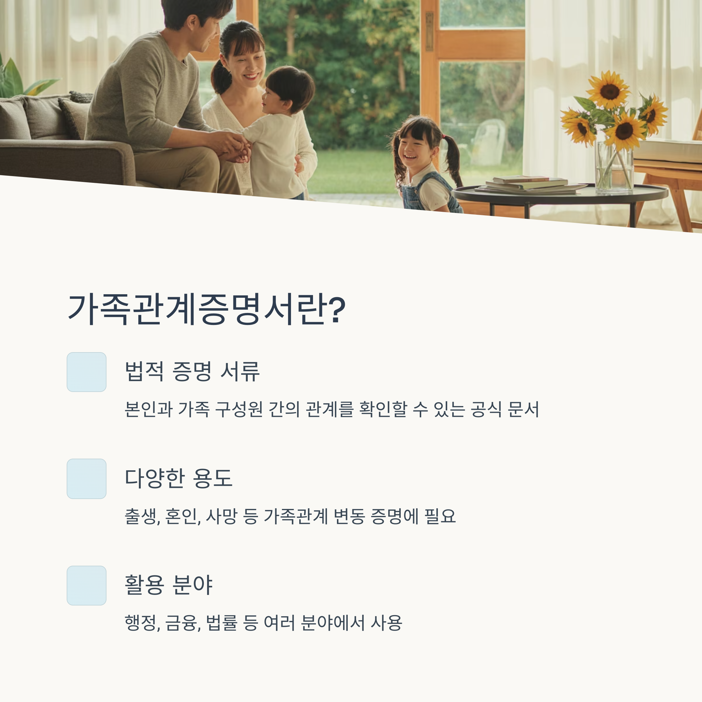 가족관계증명서는 본인과 가족 구성원 간의 관계를 확인할 수 있는 법적 서류입니다. 출생, 혼인, 사망 등의 가족관계 변동을 증명할 때 필요하며, 행정, 금융, 법률 등 다양한 분야에서 사용됩니다.