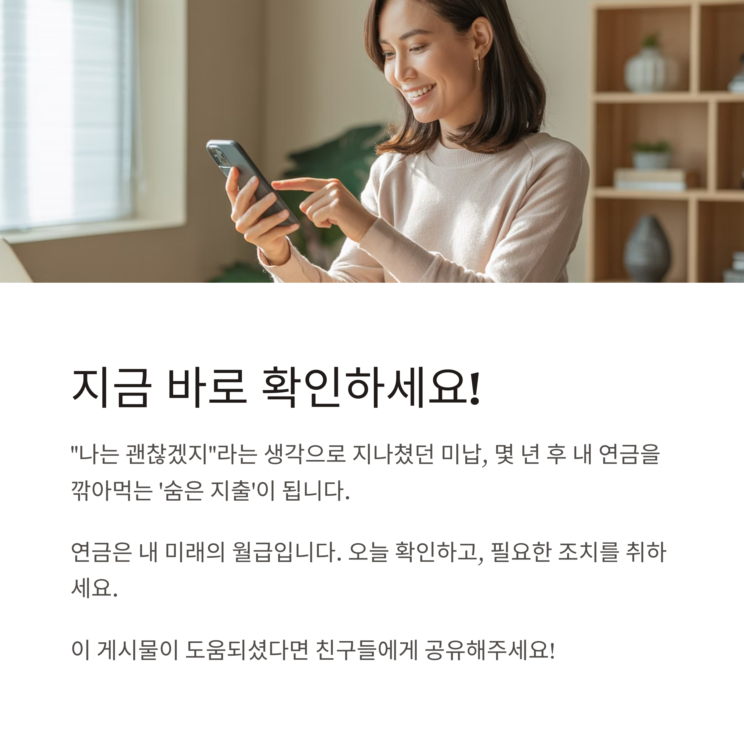 “나는 괜찮겠지”라는 생각으로 지나쳤던 미납, 몇 년이 지난 지금 불쑥 내 연금 총액을 깎아먹는 ‘숨은 지출’이 되었습니다. 연금은 내 미래의 월급입니다. 오늘 확인하고, 필요한 조치를 꼭 취하세요.
