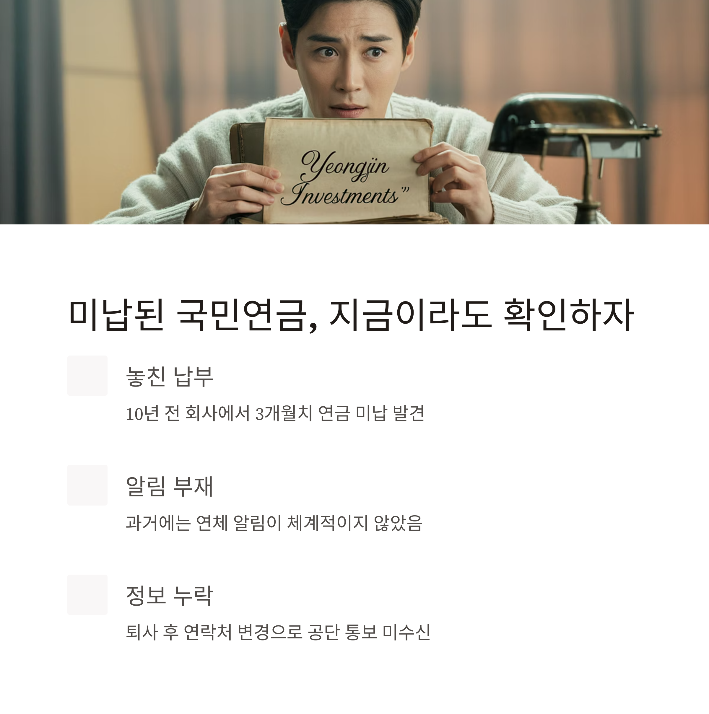 얼마 전, 오랜만에 국민연금을 조회해봤는데 10년 전 근무했던 회사에서 3개월치 연금이 미납된 사실을 발견했습니다. 회사가 경영난으로 급여를 제때 지급하지 못하면서 연금 납부도 빠졌고, 결국 폐업하며 끝내 정리되지 않았던 것 같았습니다.