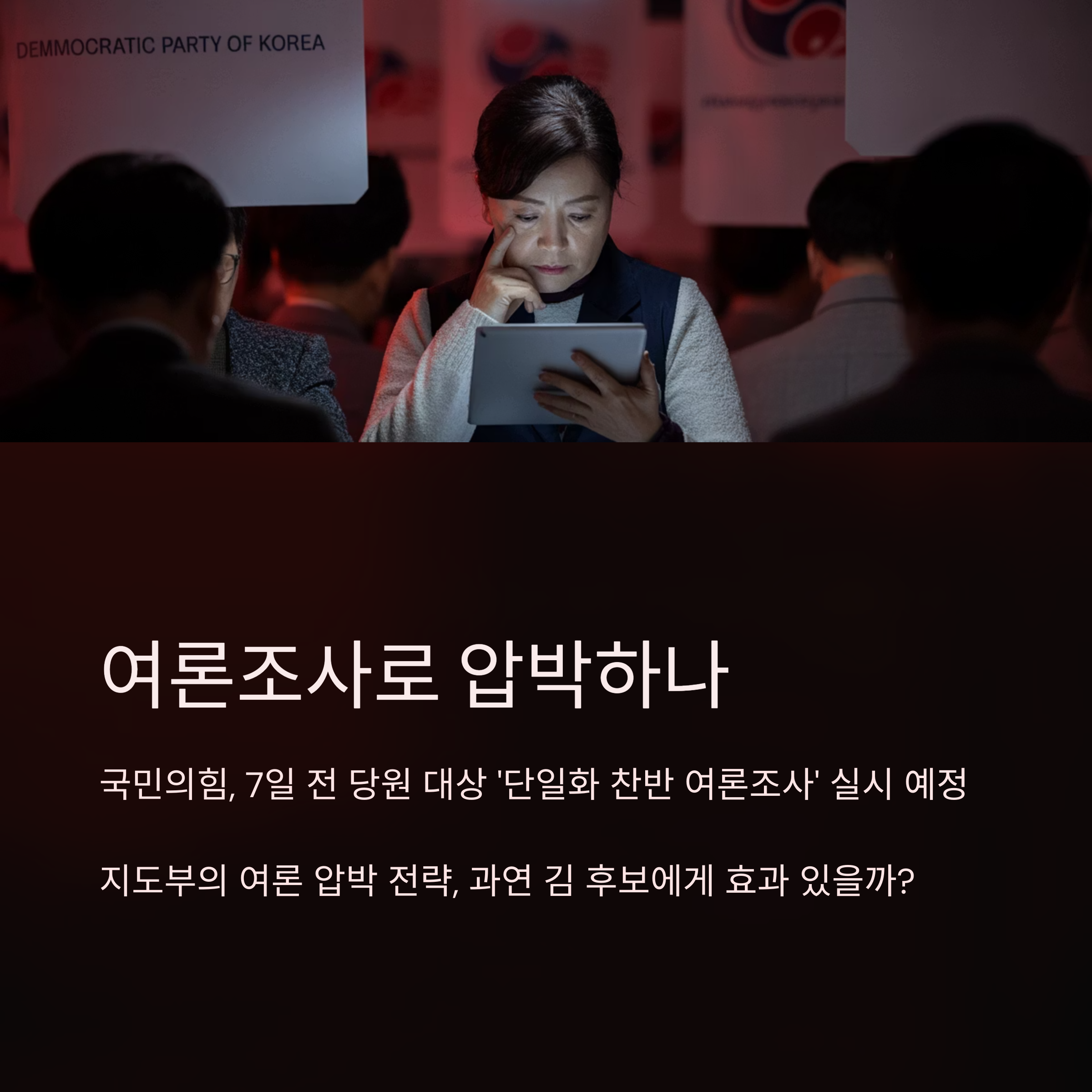 국민의힘은 7일 전 당원을 대상으로 한 ‘단일화 찬반 여론조사’를 실시하겠다고 밝혔습니다. 이는 지도부가 여론의 힘을 앞세워 김 후보를 압박하려는 전략으로 보입니다. 다만, 이 여론조사가 실제로 김 후보를 압박할 근거가 될 수 있을지는 아직 미지수입니다.