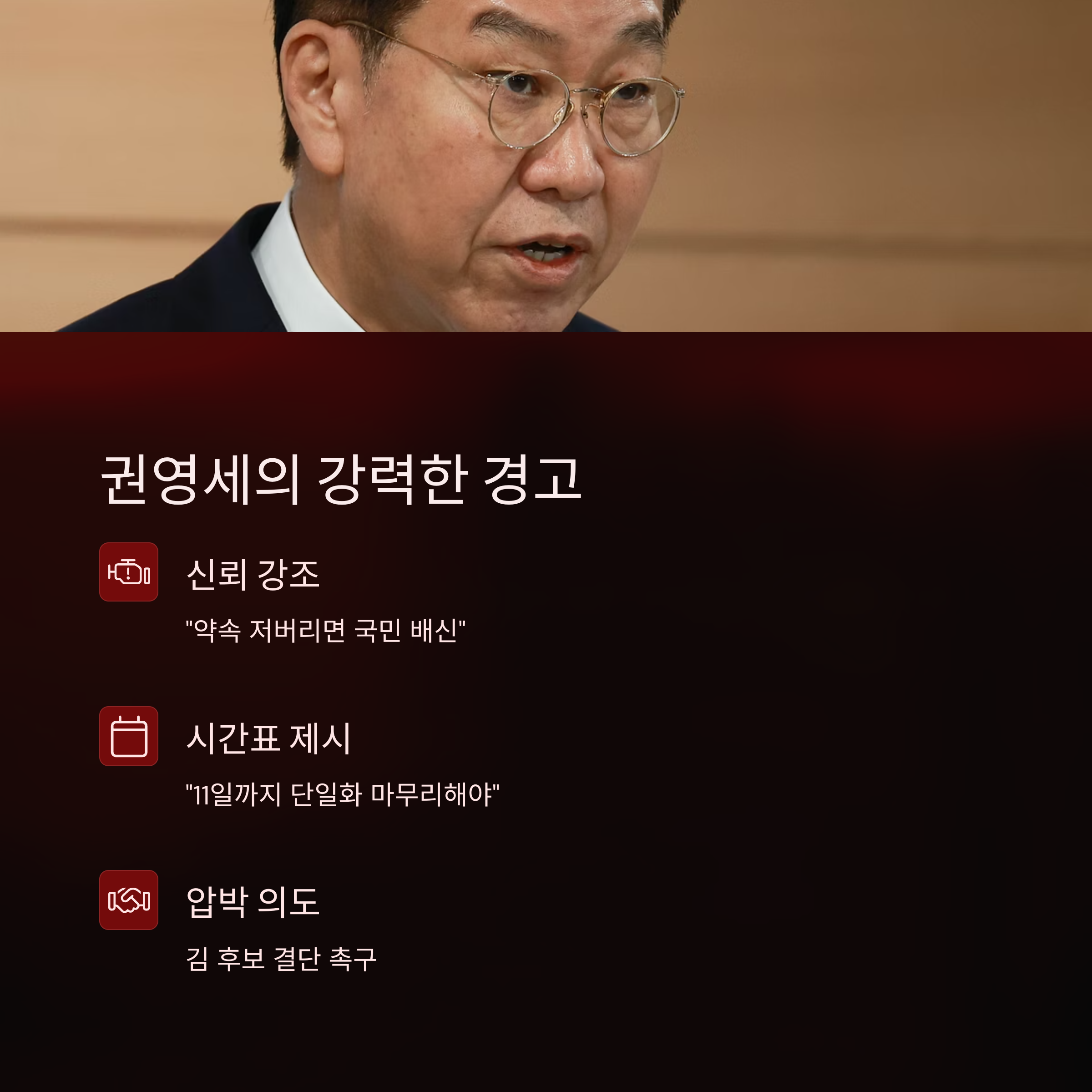 권영세 비대위원장은 이날 국회에서 김문수 후보를 사실상 겨냥하며 강도 높은 메시지를 전했습니다. “단일화 약속을 믿고 국민과 당원들이 김 후보를 선택했다. 지금 와서 신의를 저버리면 모두의 신뢰가 무너진다”는 발언은 김 후보의 결단을 압박하는 의도로 읽힙니다.