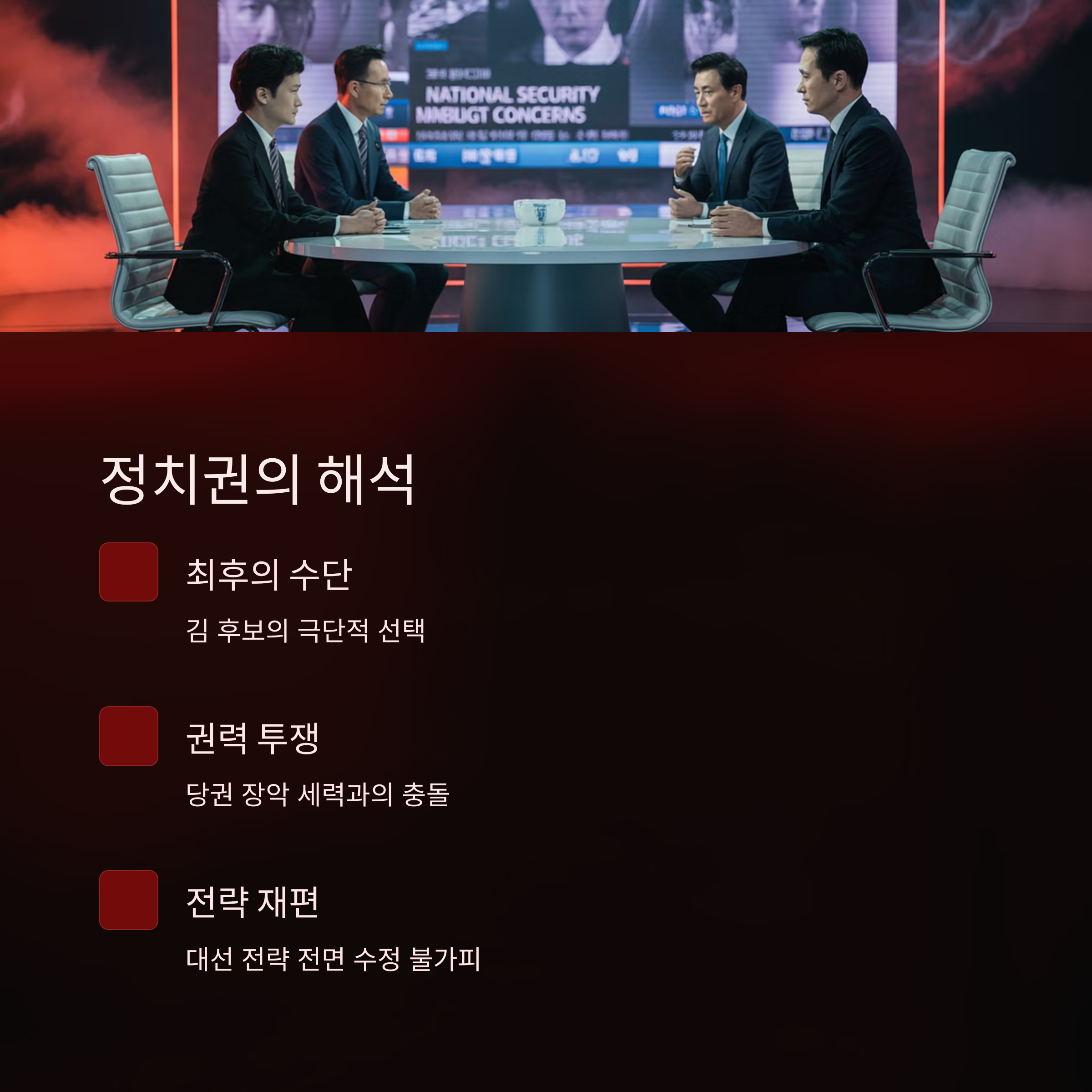 당내 일부 인사들은 김 후보의 일정 중단 발표를 “최후의 수단”이라고 보면서도, 그 배경에는 “당권을 장악하려는 세력과의 충돌”이 있다는 해석을 내놓고 있습니다. 단일화를 둘러싼 혼란이 커지는 가운데, 대선 전략 자체가 다시 짜여야 하는 상황이 벌어질 수도 있습니다.