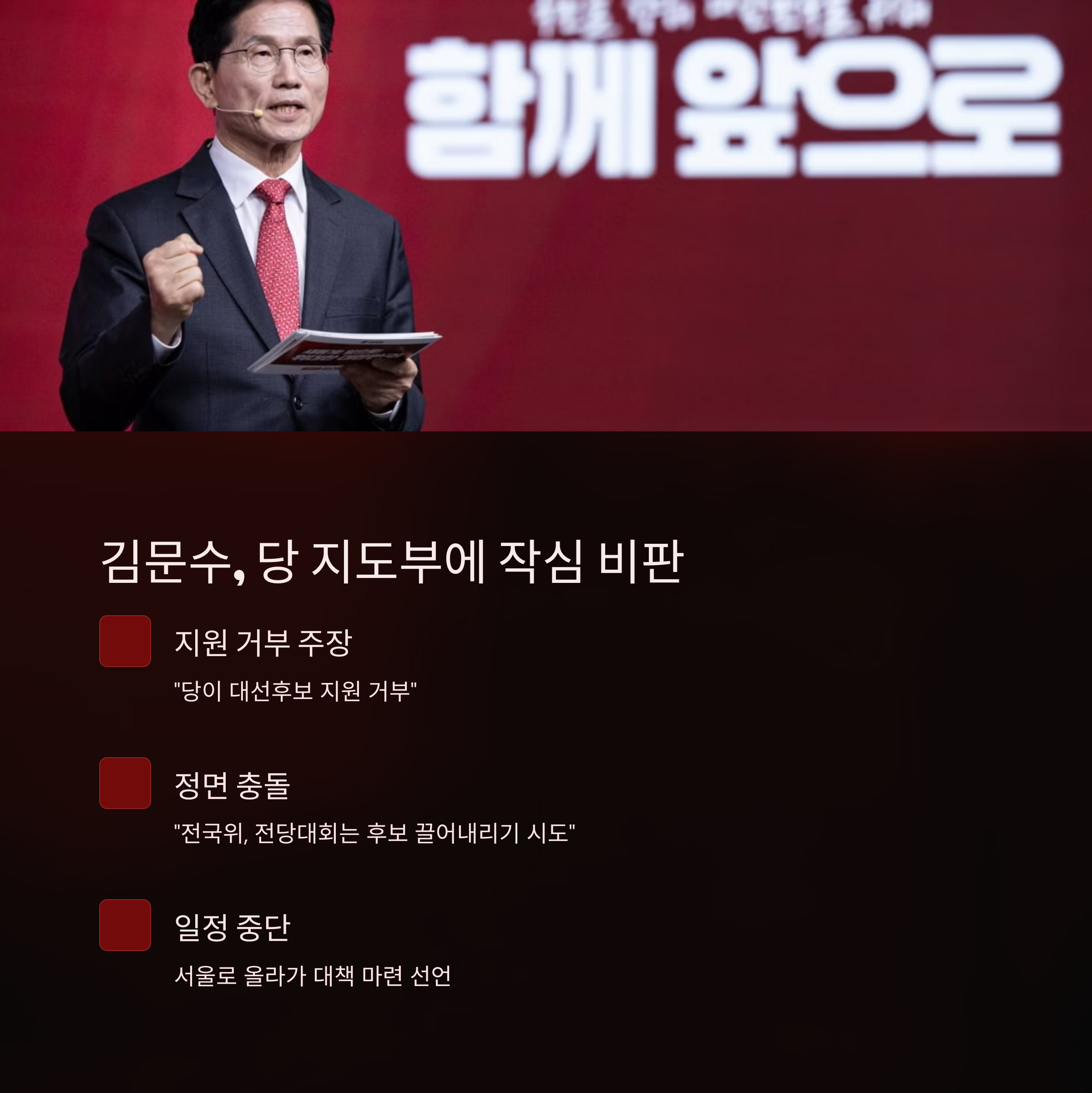 김 후보는 이날 경북 지방을 돌던 중 기자들과 만나, “당이 대선후보에 대한 지원을 거부하고 있다”며 지도부에 작심 비판을 쏟아냈습니다. 특히 "기습적으로 전국위, 전당대회를 소집한 것은 정당한 후보를 끌어내리려는 시도"라고 주장하며, 후보로서의 일정을 중단하고 서울로 올라가 대책을 마련하겠다고 밝혔습니다.