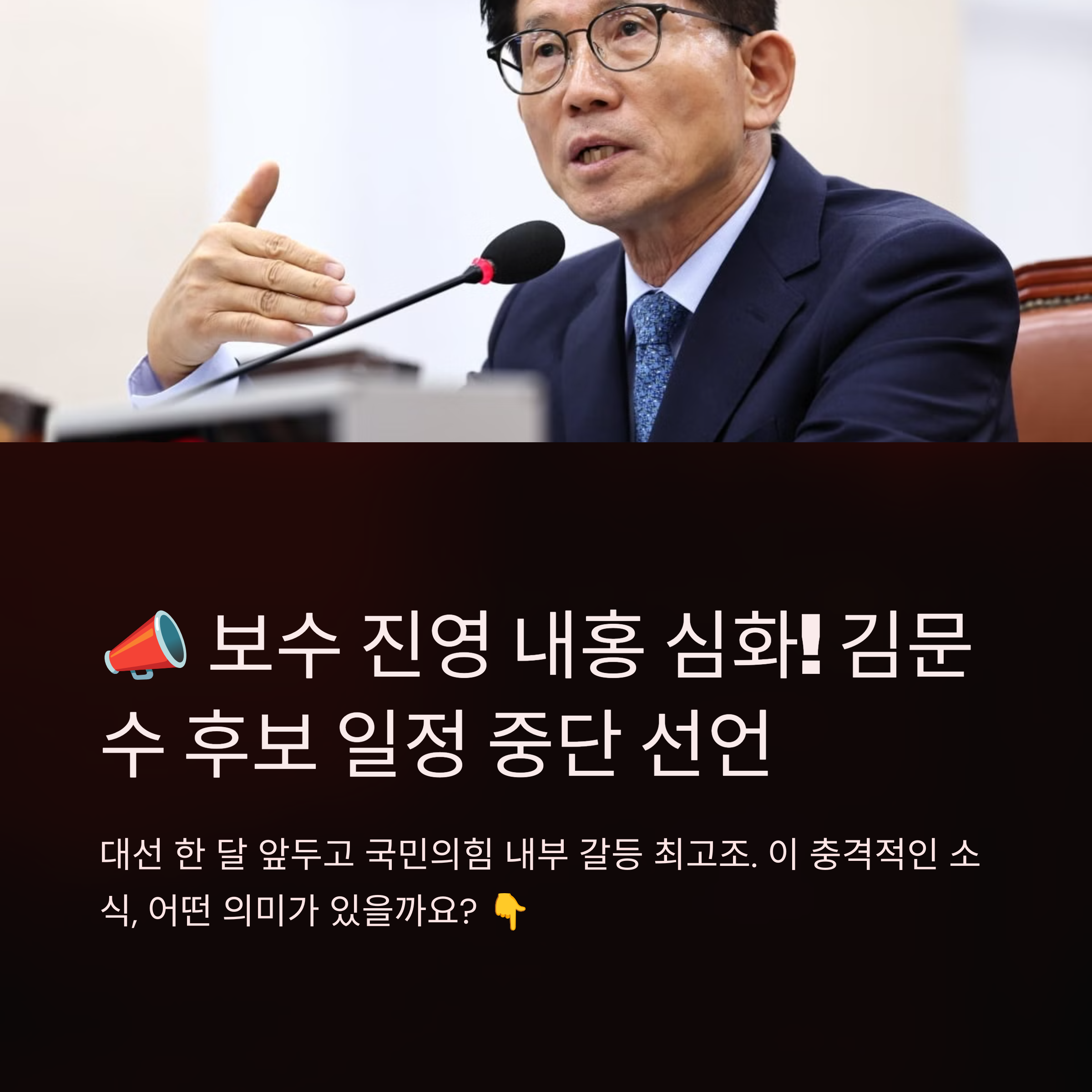 김문수 후보의 일정 중단은 단순한 메시지가 아닌, 당내 분열의 신호탄일 수 있습니다. 단일화를 요구하는 당과 이를 견제하려는 후보 간의 갈등이 더 이상 수습되지 않는다면, 보수 진영 전체의 결집력도 흔들릴 수밖에 없습니다.