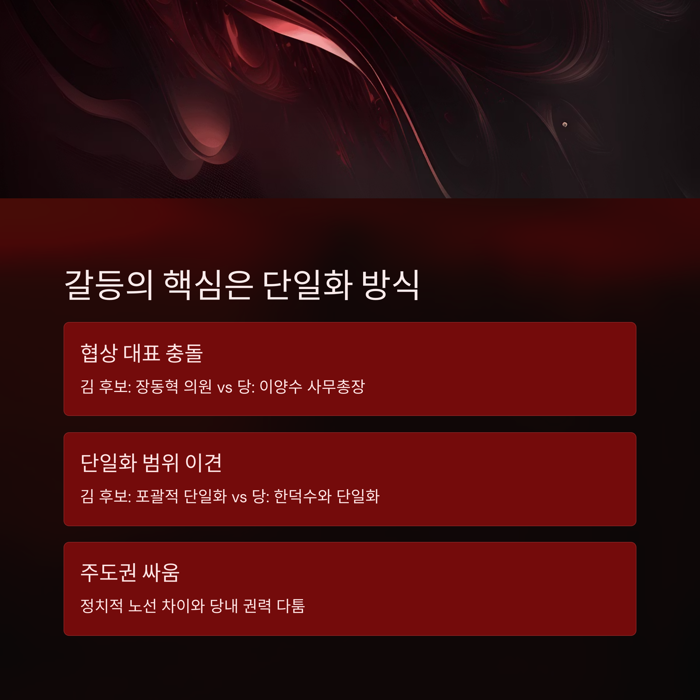 또한 김 후보는 선대위 구성을 먼저 요구하며 개혁신당, 새미래민주당과의 포괄적 단일화를 주장한 반면, 당 지도부는 오직 한 후보와의 단일화를 최우선으로 요구했습니다. 이 차이는 정치적 노선 차이이자 당내 주도권 싸움의 일환으로 보입니다.