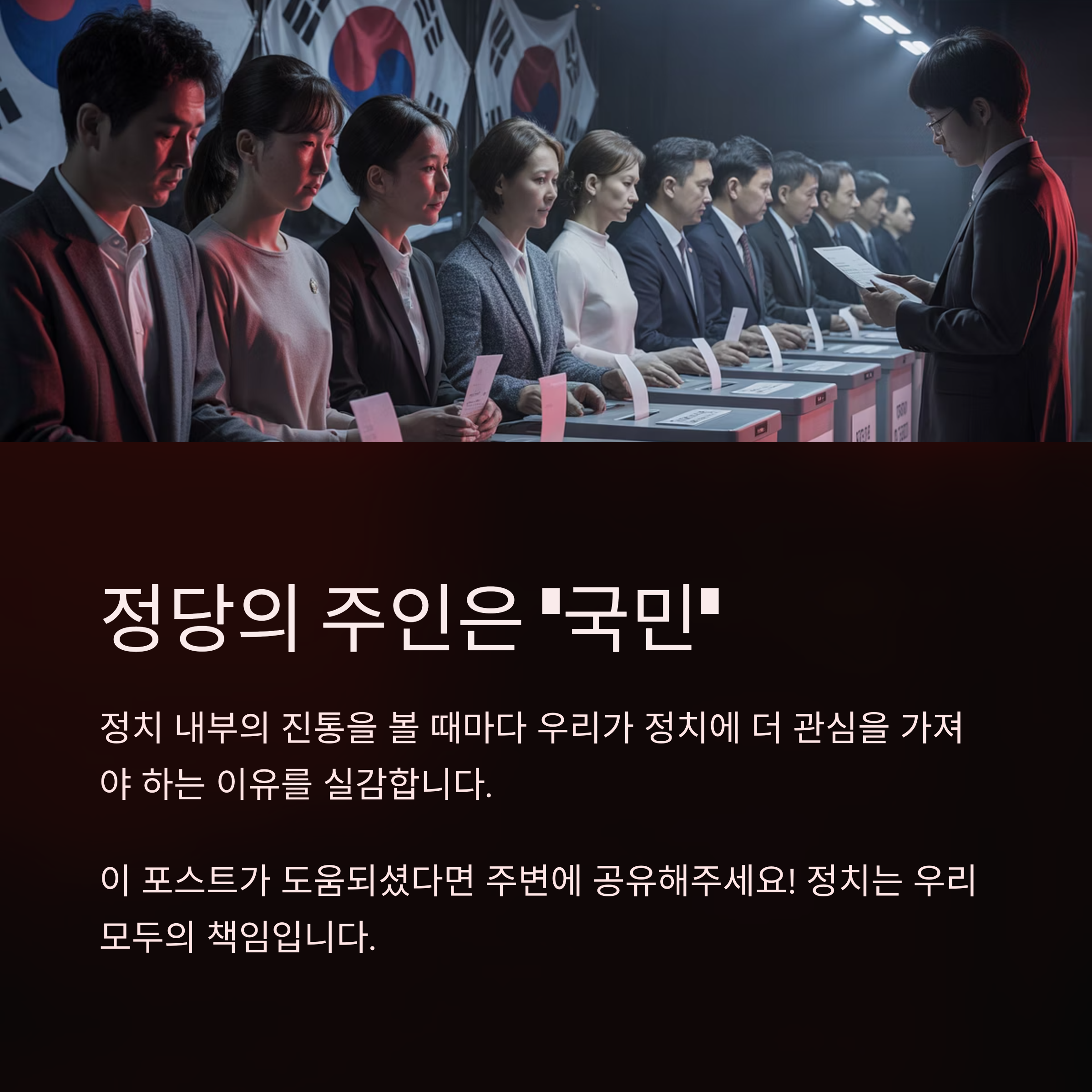 정치 기사가 일상이 된 요즘, 이렇게 내부에서 벌어지는 진통들을 볼 때마다 우리가 왜 정치에 더 관심을 가져야 하는지 실감하게 됩니다. 정당의 주인은 결국 ‘국민’이라는 사실, 잊지 말아야겠습니다.
