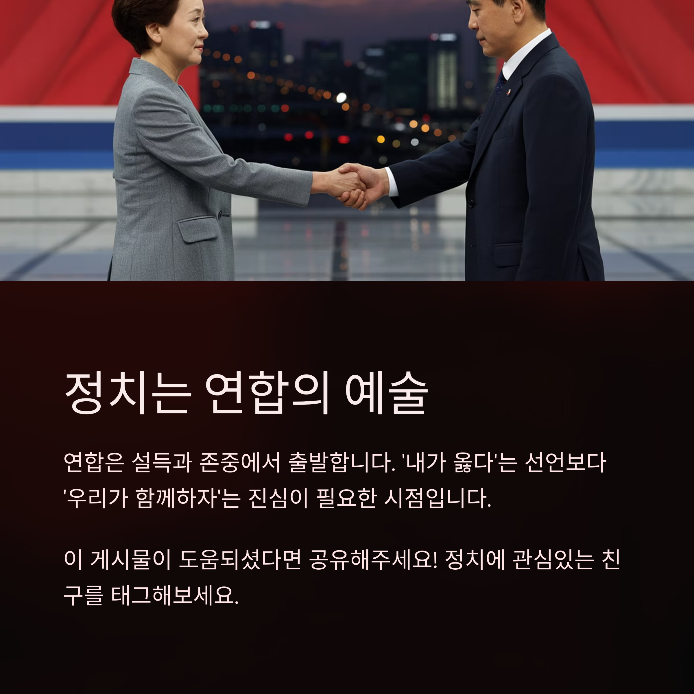 정치는 연합의 예술이라고들 하죠. 하지만 그 연합은 설득과 존중에서 출발합니다. 지금 필요한 건 ‘내가 옳다’는 선언보다, ‘우리가 함께하자’는 진심 아닐까요?