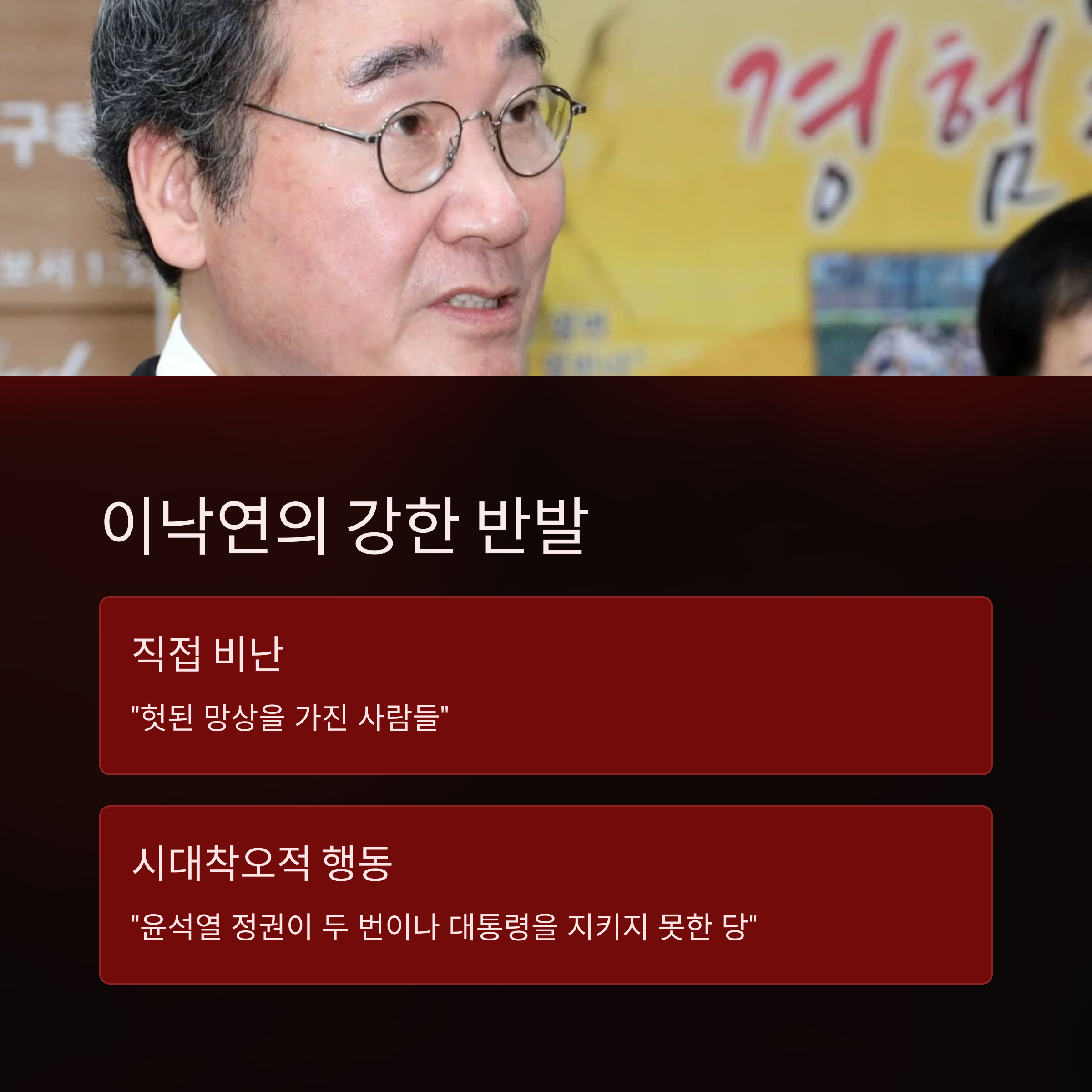 이낙연 전 총리는 한 방송 인터뷰에서 김 후보를 강하게 비난했습니다. “그런 헛된 망상을 가진 사람들에게는 내 손톱만큼도 도와줄 생각이 없다. 보고 싶지도 않다”며, 단일화 제안 자체를 무례하고 무책임한 시도라 규정했습니다.