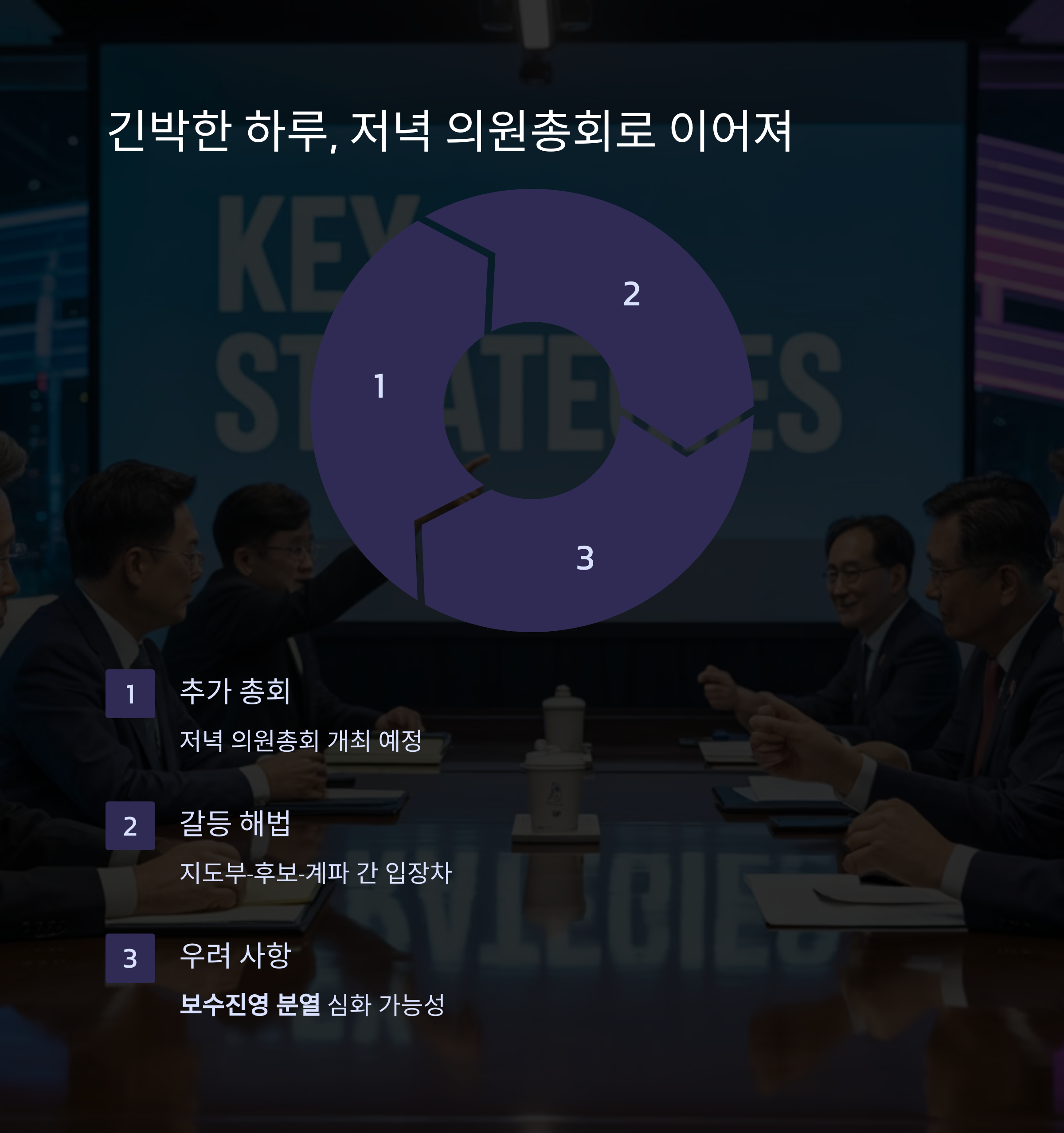 국민의힘은 이날 저녁 추가 의원총회를 개최해 갈등 해법을 모색할 예정입니다. 그러나 지도부와 후보, 그리고 계파 간의 입장 차가 좁혀지지 않으면 이번 대선은 단일화는커녕 보수진영의 분열만 더 심화될 수도 있습니다.