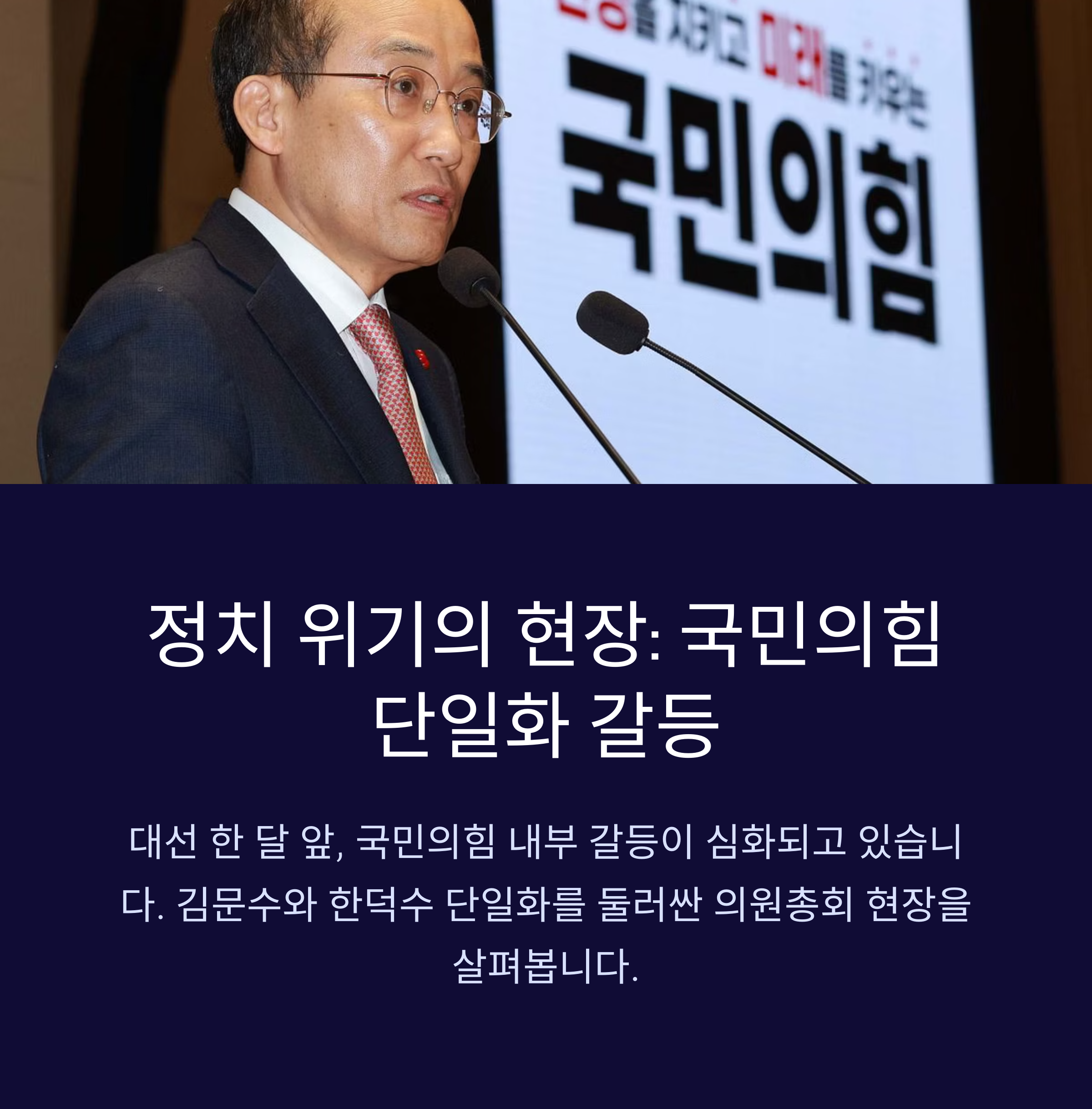 대선을 한 달도 남기지 않은 시점, 국민의힘이 극심한 내홍 속에서 단일화 논의를 이어가고 있습니다. 김문수 대선후보와 한덕수 전 국무총리의 단일화를 두고 6일 열린 의원총회는 단순한 회의가 아닌 ‘위기 경고등’이 켜진 장면이었습니다.