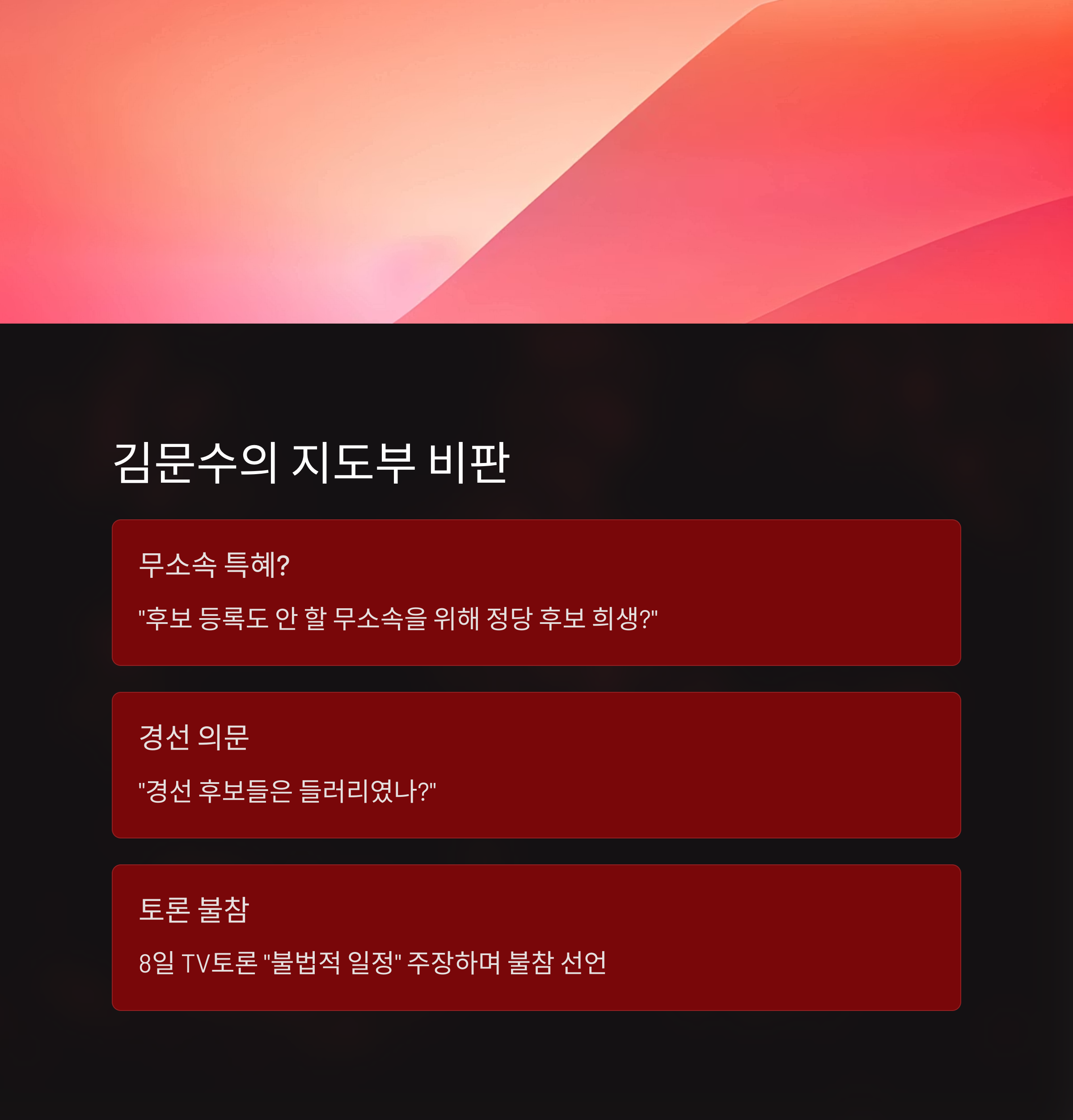 김 후보는 국민의힘 지도부를 향해 “후보 등록도 하지 않겠다는 무소속 후보를 위해 왜 본선을 준비하는 정당 후보를 희생시키려 하느냐”고 질타했습니다. 또한 “경선 후보들은 들러리였던 것이냐”는 말로 정당 내 경선 과정 자체의 정당성에 의문을 던졌습니다.