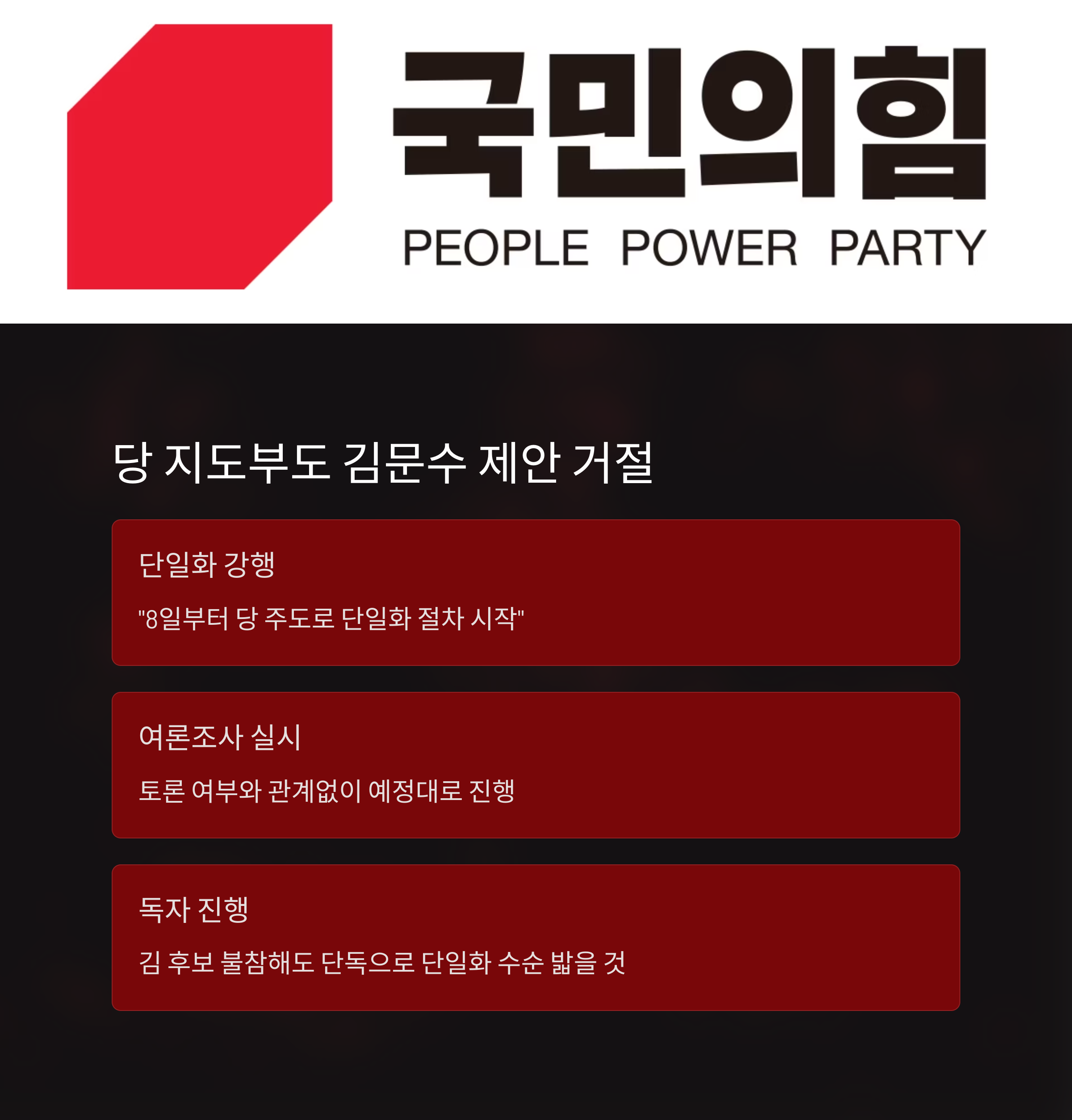 그는 “지금의 단일화는 감동도, 시너지 효과도 없다”며 “정당한 경선을 거친 본인을 끌어내리려는 강압적 단일화”라고 반발했습니다. “당헌 제74조의 당무우선권을 발동하겠다”는 강경한 태도도 덧붙였습니다.