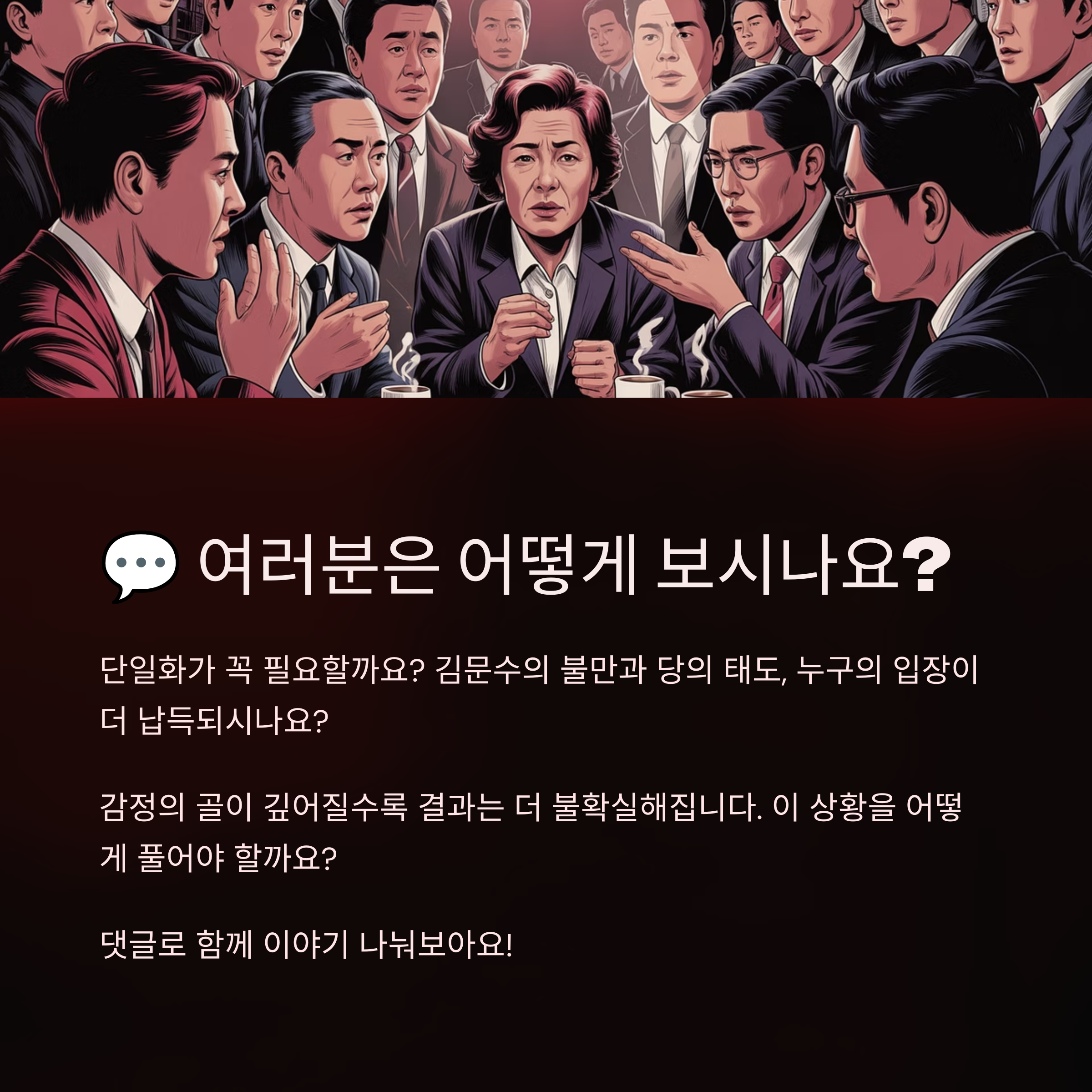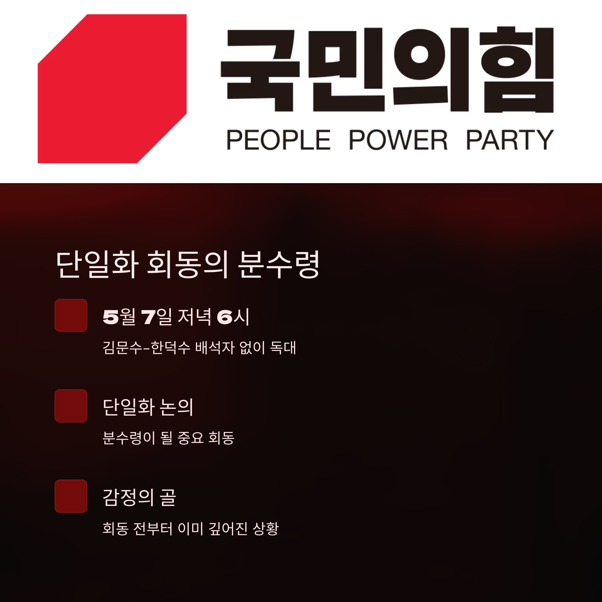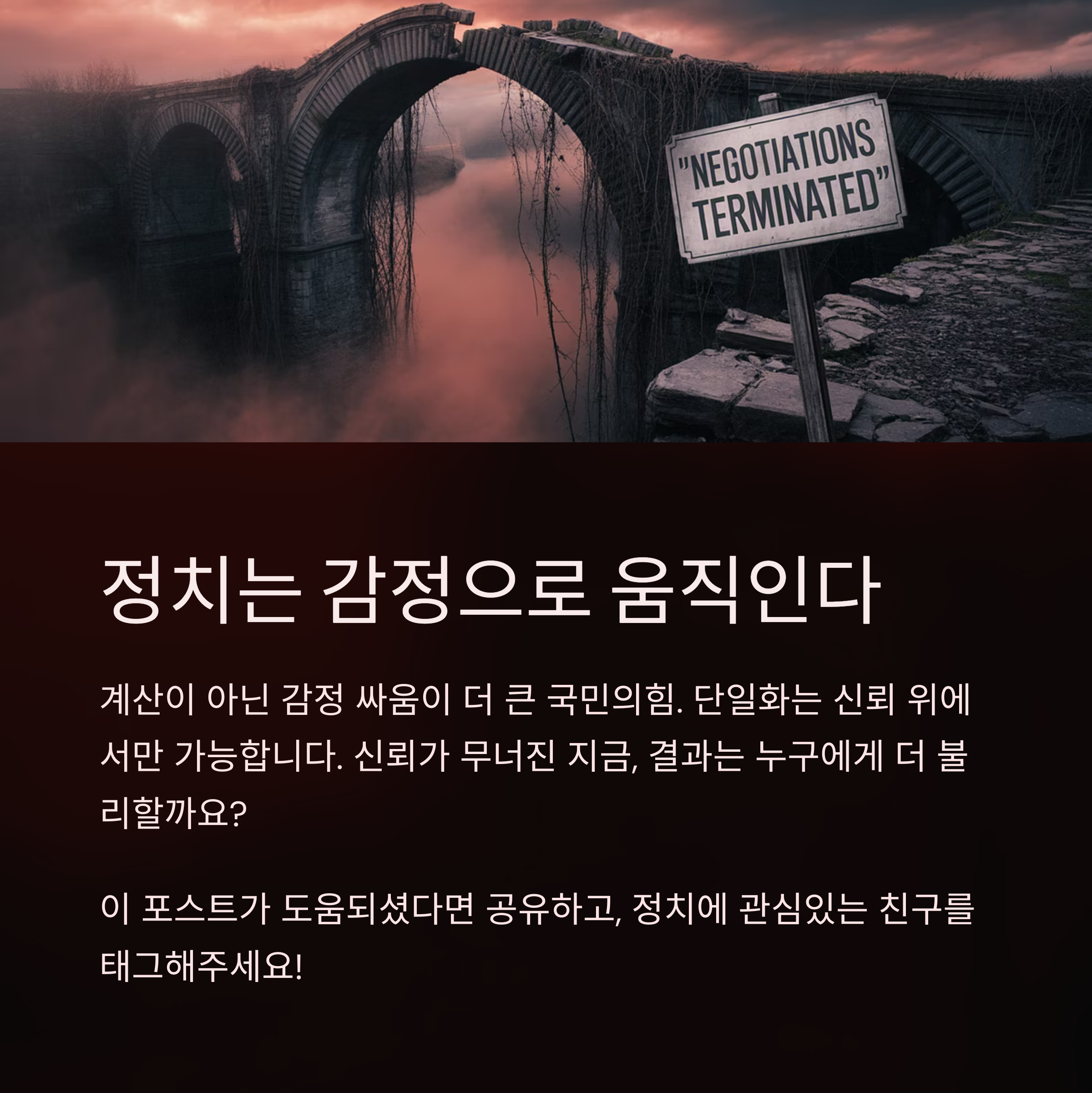 정치는 사람의 감정으로 움직입니다. 지금의 국민의힘은 계산이 아닌 감정 싸움이 더 크다는 생각이 들어요. 단일화는 기술이 아니라 신뢰 위에서만 가능합니다. 신뢰가 무너진 지금, 그 결과는 과연 누구에게 더 불리할까요?