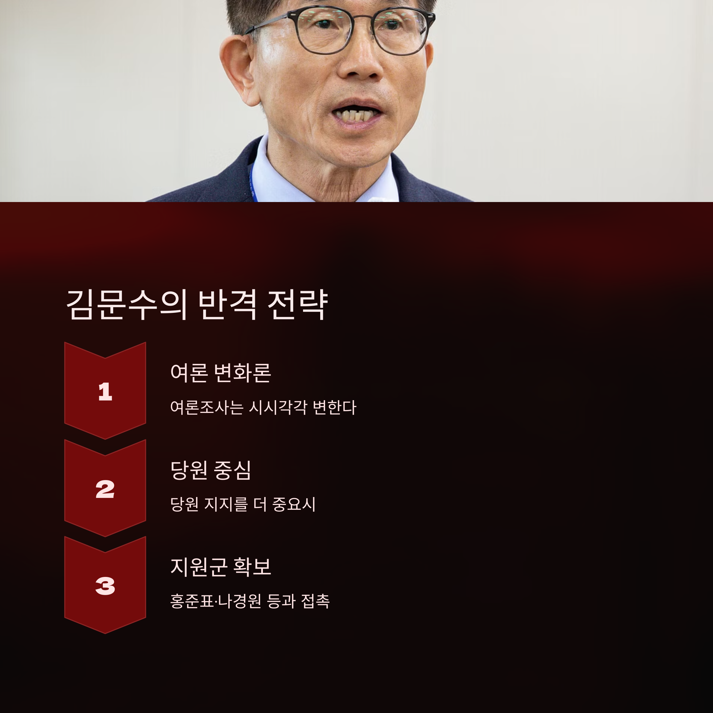 이에 대해 김문수 후보 측은 여론조사 수치는 시시각각 바뀌며, 당원 중심의 지지를 더 중요하게 본다는 논리를 앞세우고 있습니다. 심지어 김 후보는 홍준표·나경원 등 당내 인물과 접촉하며 지원군을 끌어들이려는 움직임까지 보이고 있어요. 이는 사실상 장기전을 염두에 둔 포석이라는 해석도 나옵니다.
