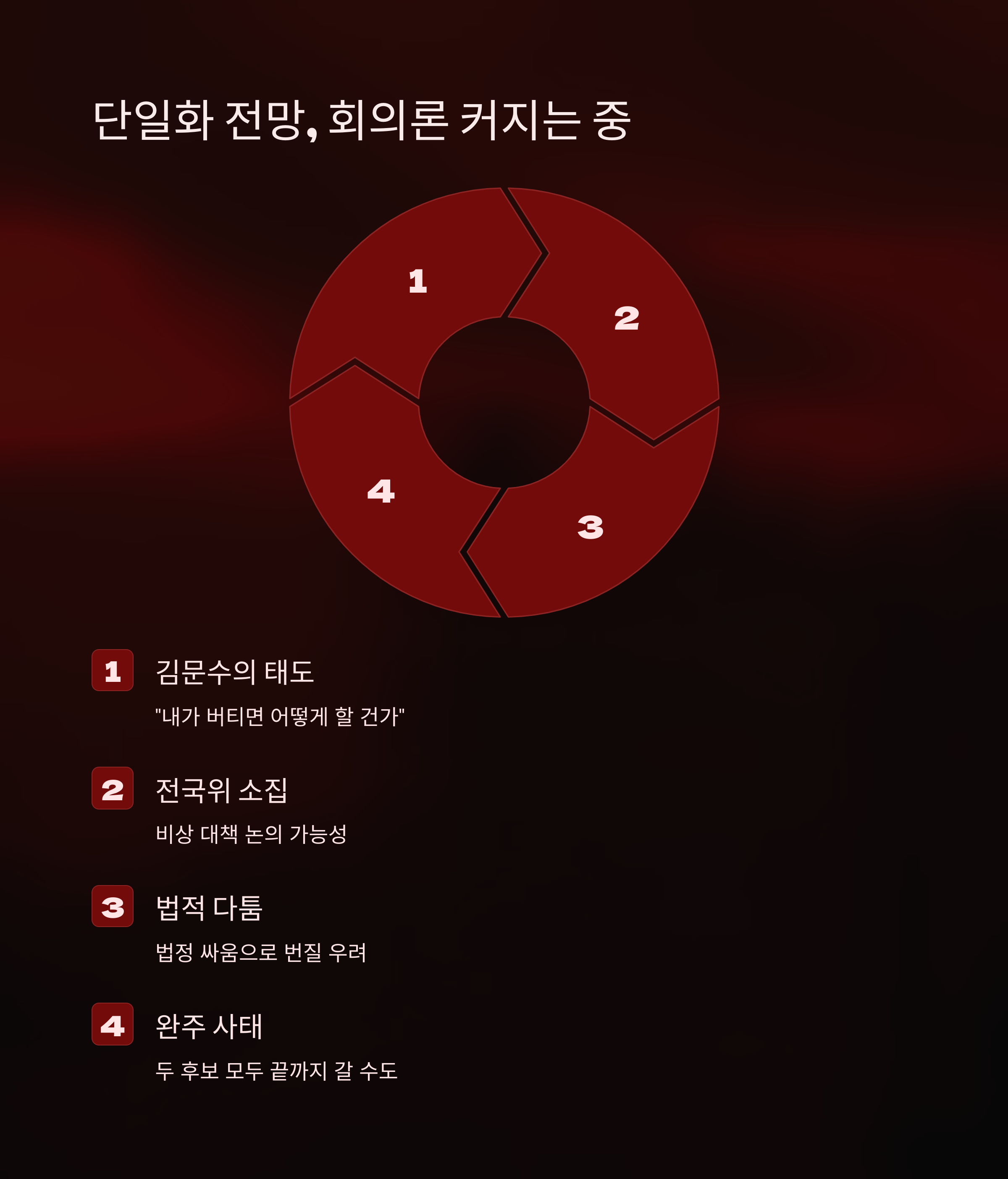 이제 남은 변수는 김문수의 태도 변화입니다. 그는 지금 “내가 버티면 어떻게 할 건가”라는 식의 전략적 침묵도 보이고 있습니다. 전국위 소집, 법적 다툼 가능성까지 언급되는 가운데, 단일화 실패 시 두 후보가 모두 완주하는 사태까지 우려되고 있어요.