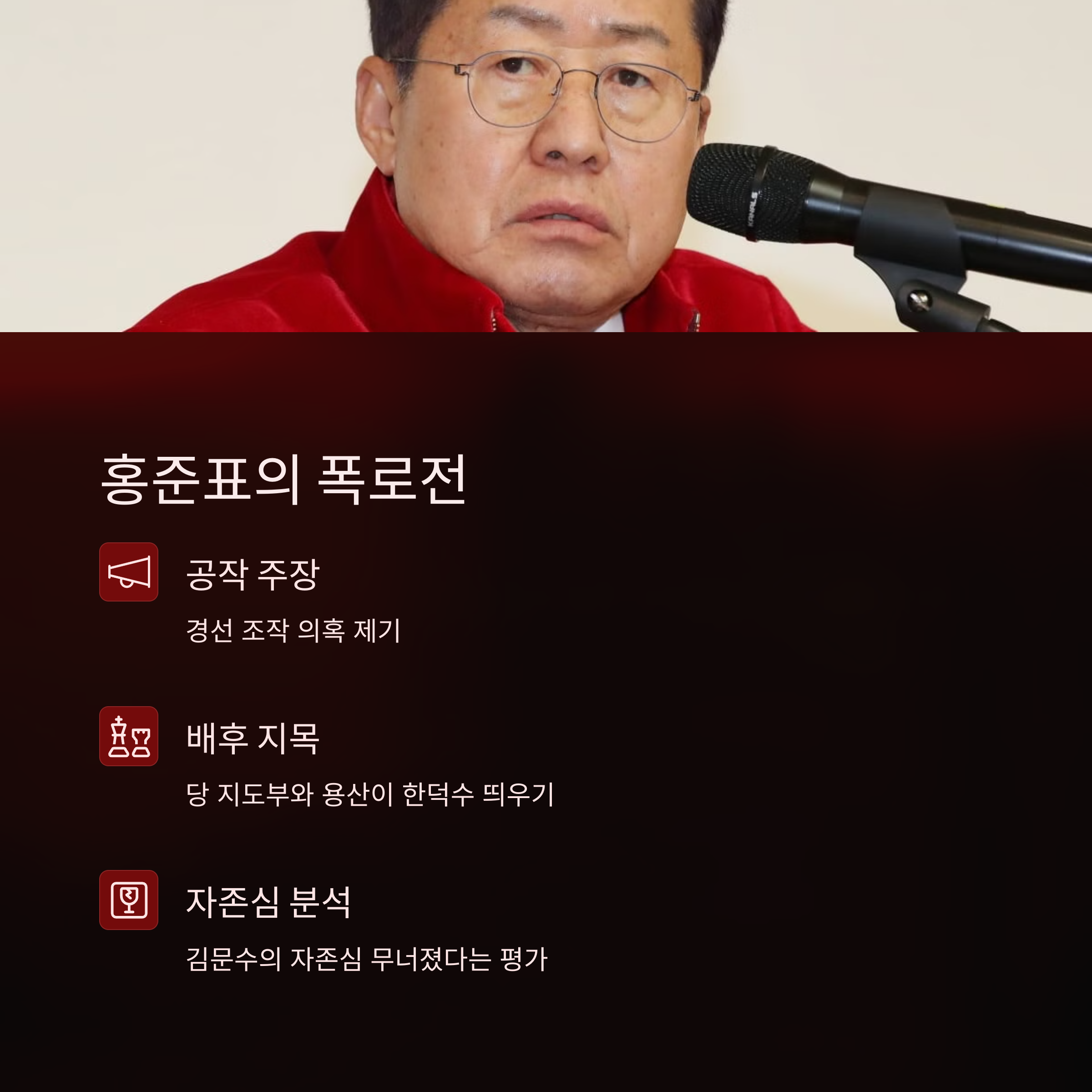홍준표 전 시장은 “김문수는 당 지도부가 밀어붙였고, 자신은 ‘방해물’이라 탈락시킨 공작의 피해자”라며, 당 지도부와 용산이 한덕수를 띄우기 위해 경선을 조작했다는 주장을 폈습니다. 김 후보가 당선된 후 다시 압박을 받자 “그의 자존심이 무너진 것”이라는 분석도 나옵니다.