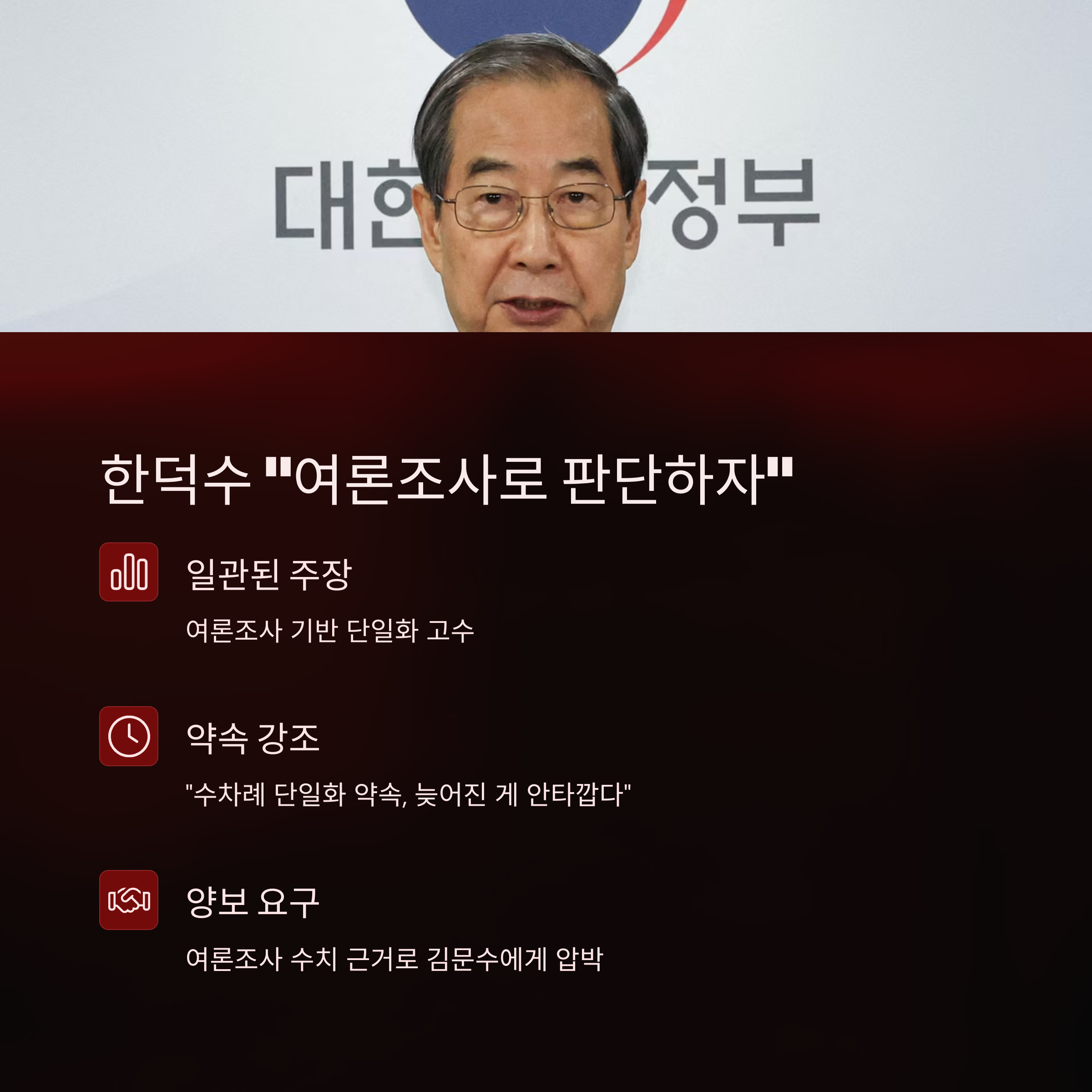한덕수 후보 측은 일관되게 여론조사 기반 단일화를 주장해왔고, “수차례 단일화를 약속했고, 늦어진 게 안타깝다”는 입장을 반복 중입니다. 회동에서도 이 입장을 고수할 가능성이 높으며, ‘여론조사 수치’를 근거로 김문수에게 양보를 요구할 것으로 보입니다.