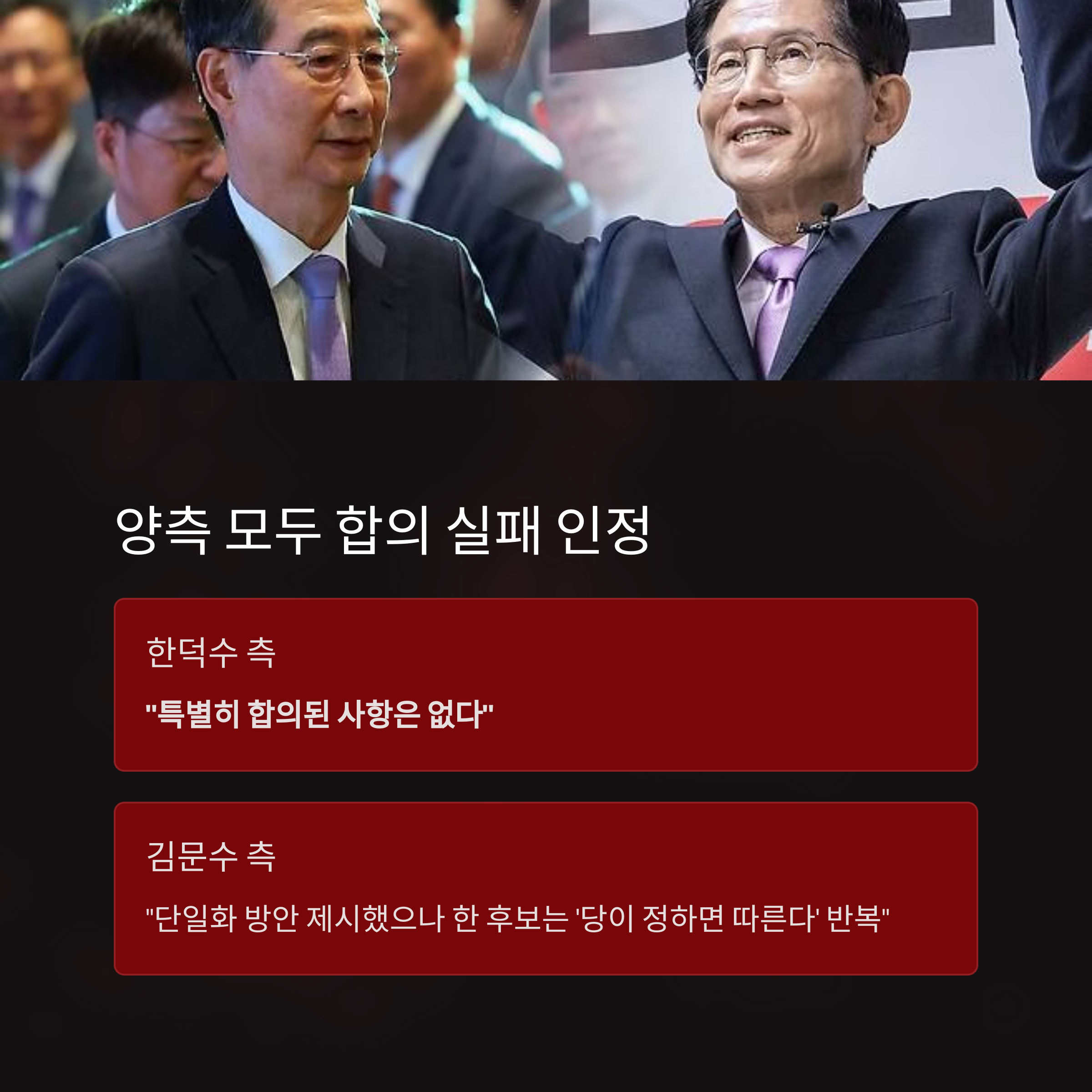 한 후보 측은 회동 직후 “특별히 합의된 사항은 없다”고 밝혔고, 김 후보 측도 “나름의 단일화 방안을 제시했지만 한 후보는 ‘당이 정하면 따른다’는 입장만 반복했다”고 설명했습니다.