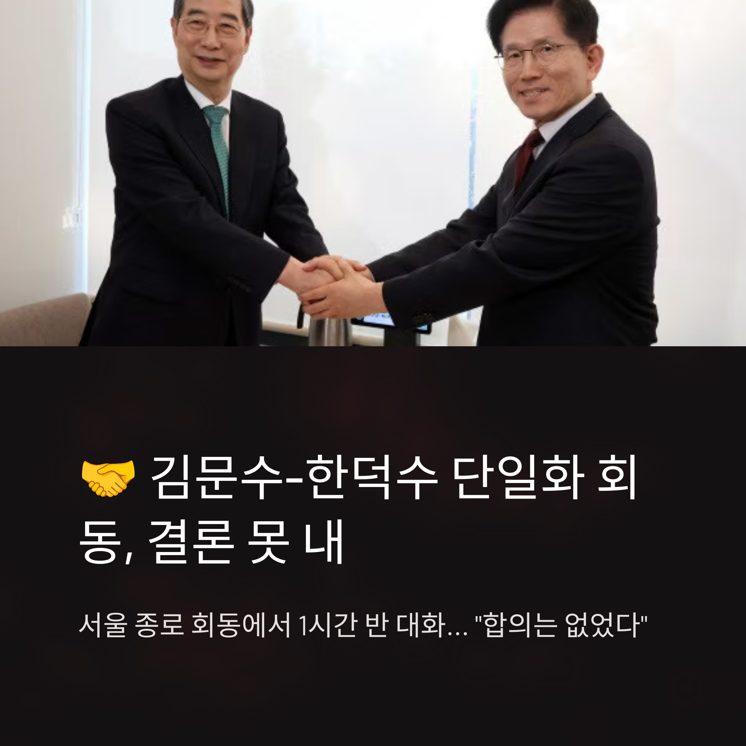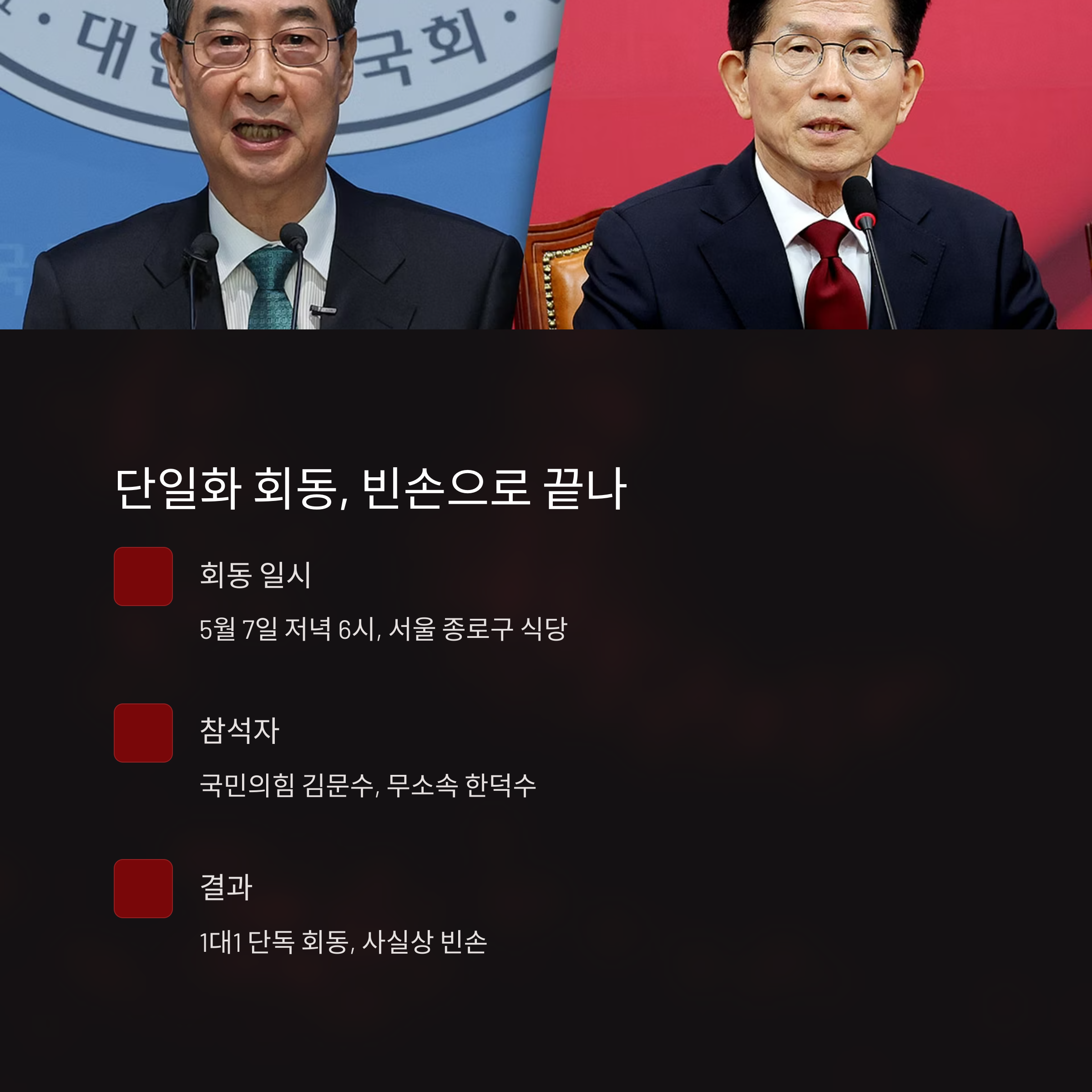 국민의힘 김문수 후보와 무소속 한덕수 후보가 2025년 5월 7일 저녁 6시, 서울 종로구의 한 식당에서 1대1 단독 회동을 가졌습니다. 두 후보는 덕담을 주고받으며 시작했지만, 회동 결과는 사실상 빈손이었습니다.