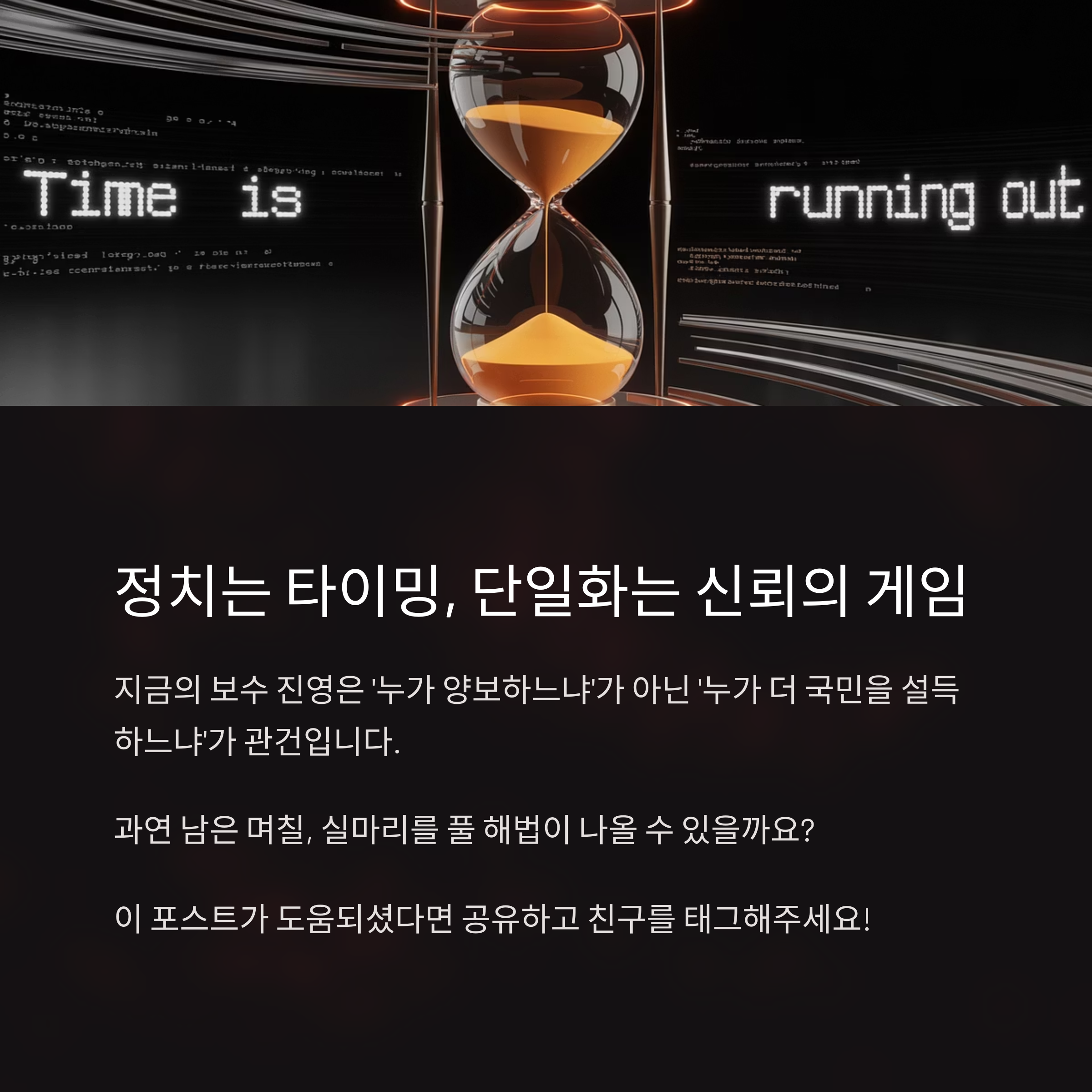 정치는 타이밍이고, 단일화는 신뢰의 게임입니다. 지금의 보수 진영은 ‘누가 양보하느냐’가 아닌 ‘누가 더 국민을 설득하느냐’가 관건인 것 같습니다. 과연 남은 며칠, 실마리를 풀 해법이 나올 수 있을까요?