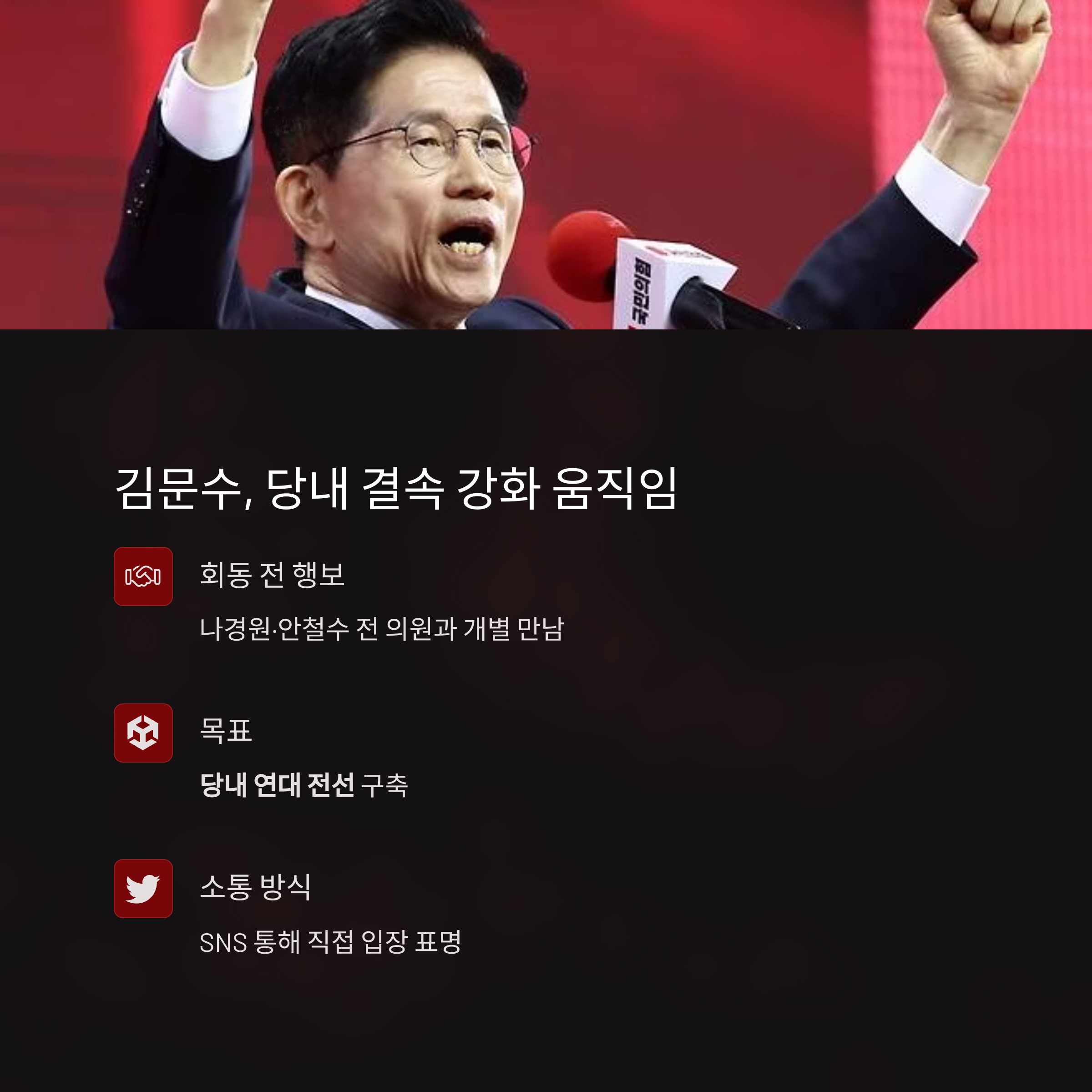 김 후보는 이날 회동 전, 나경원·안철수 전 의원을 각각 만나며 당내 연대 전선을 강화하고 있는 모습도 보였습니다. “대선 승리를 위해 당이 힘을 하나로 모아야 한다”는 의견을 공유했다고 SNS에 직접 밝혔습니다.