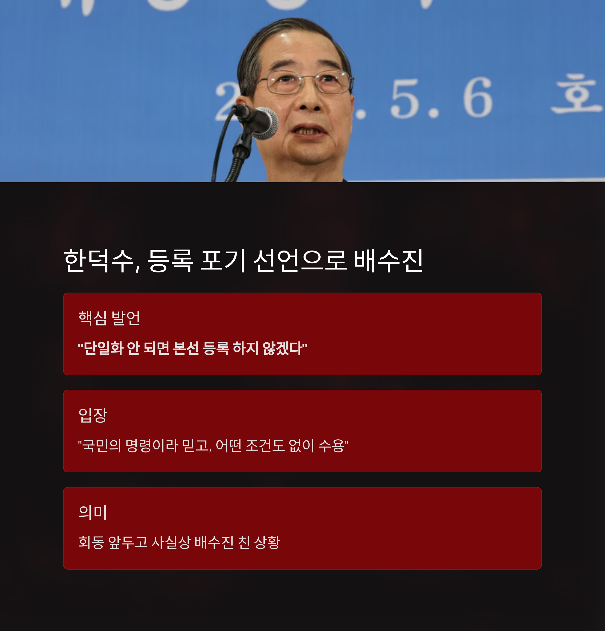한덕수 후보는 회동 직전 열린 기자회견에서 “단일화가 안 되면 본선 등록을 하지 않겠다”는 입장을 밝혀 강한 결단 의지를 드러냈습니다. “국민의 명령이라 믿고, 어떤 조건도 없이 수용하겠다”는 발언은 회동을 앞두고 나온 사실상 배수진이었습니다.