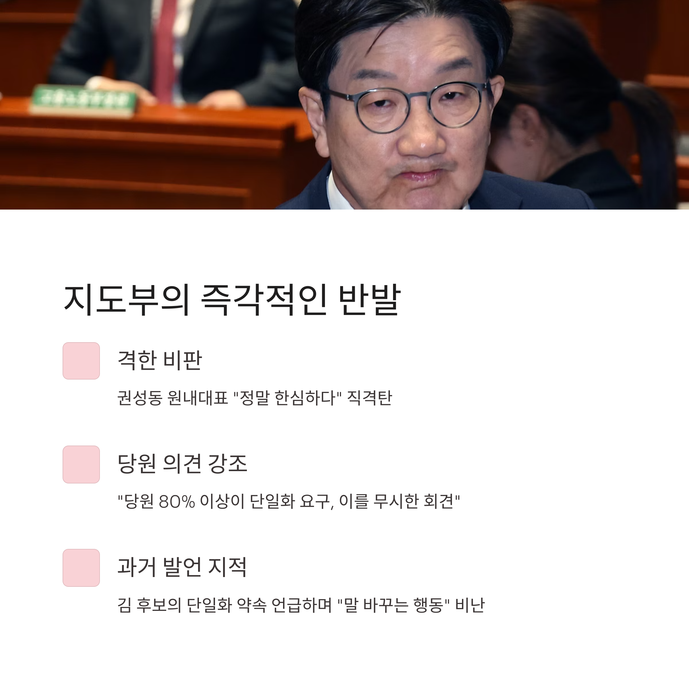 김 후보의 회견 직후 열린 비상대책위원회에서 권성동 원내대표는 격한 어조로 김 후보를 비판했습니다. “당원 80% 이상이 단일화를 요구했고, 그건 등록 전이라는 조건까지 포함된 명령이다. 이를 무시한 회견은 알량한 자리 지키기”라며 “정말 한심하다”고 직격탄을 날렸습니다.