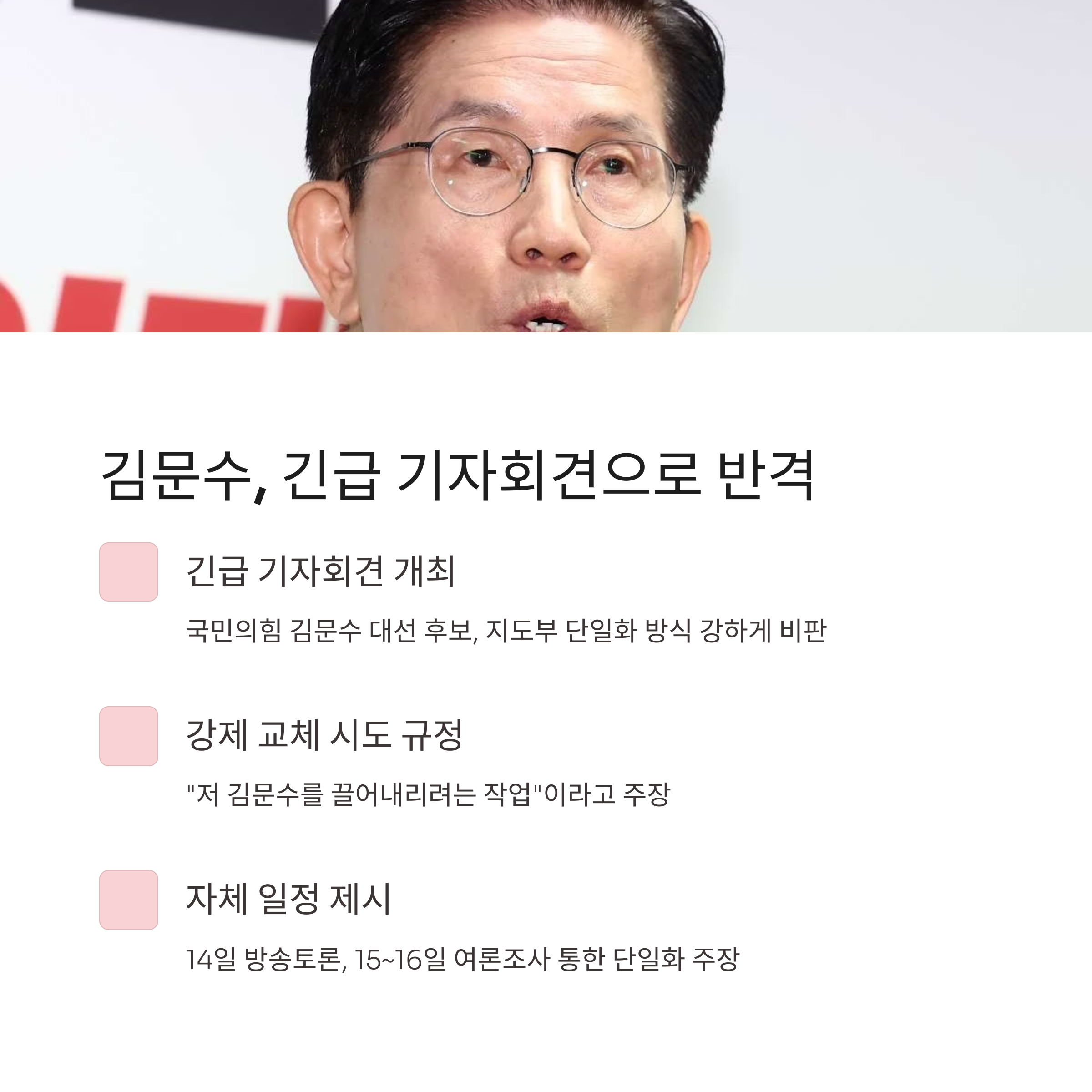 김 후보는 자체 단일화 일정을 제시하며, “일주일간 선거운동을 거쳐 14일 방송토론, 15~16일 여론조사로 단일화하자”고 주장했습니다. “계속해서 지도부가 밀어붙이면 법적 조치도 검토하겠다”고 경고했습니다.