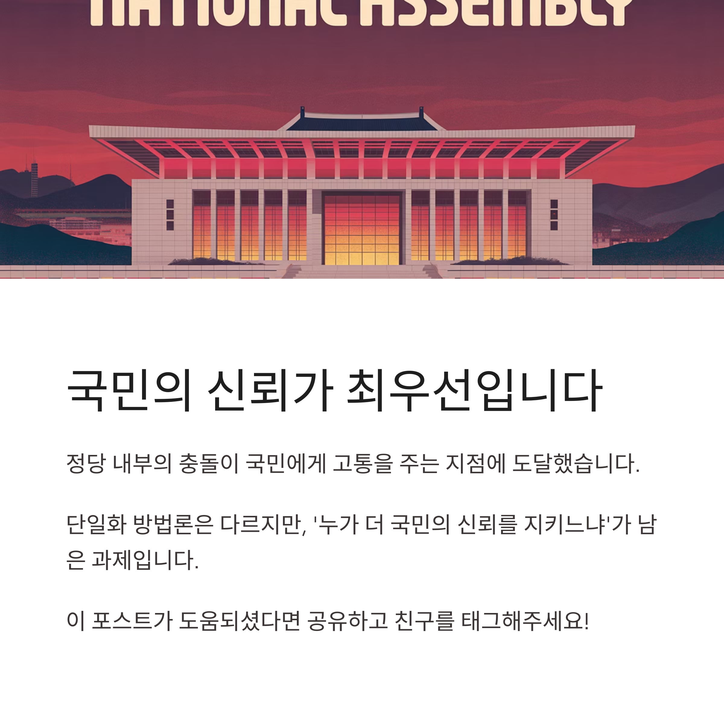 정당 내부의 충돌이 국민에게 고통을 주는 지점에 도달했습니다. 단일화라는 목표를 향한 방법론은 다르지만, 결국 ‘누가 더 국민의 신뢰를 지키느냐’가 남은 과제가 아닐까요?