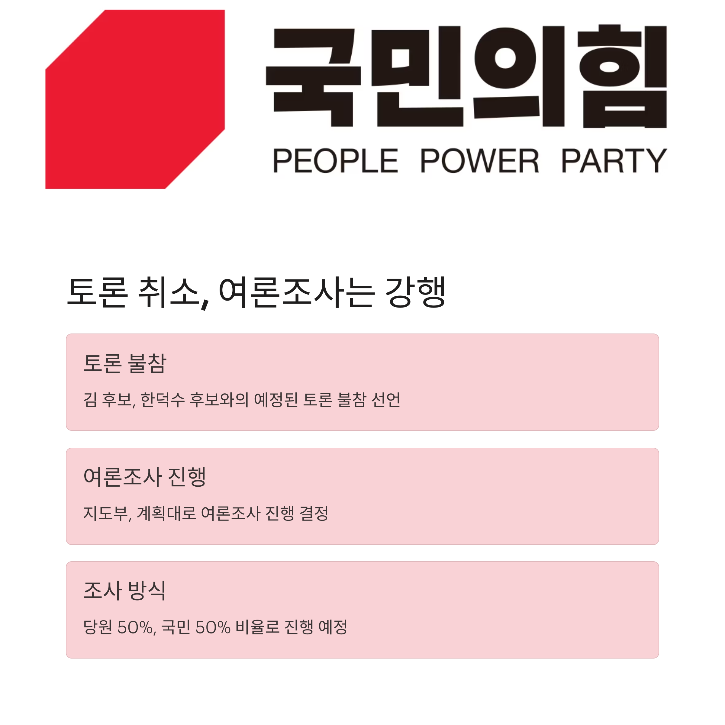 김 후보는 이날 예정됐던 한덕수 후보와의 토론에도 불참하겠다고 밝혔습니다. 하지만 지도부는 계획대로 여론조사를 진행하겠다고 밝혔습니다. 여론조사 방식은 당원 50%, 국민 50%로 이뤄질 예정입니다.
