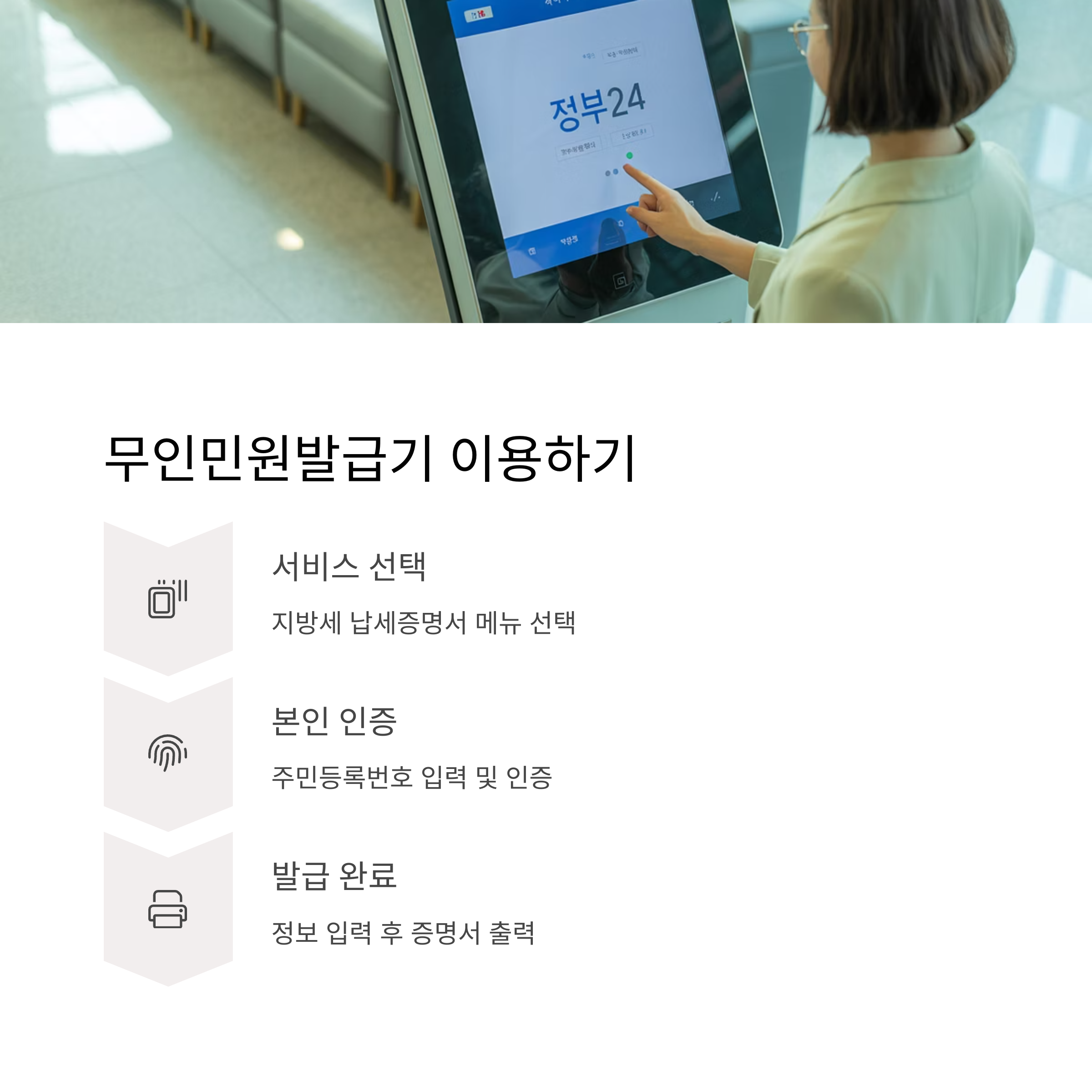 - 무인민원발급기에서 '지방세 납세증명서'를 선택합니다.