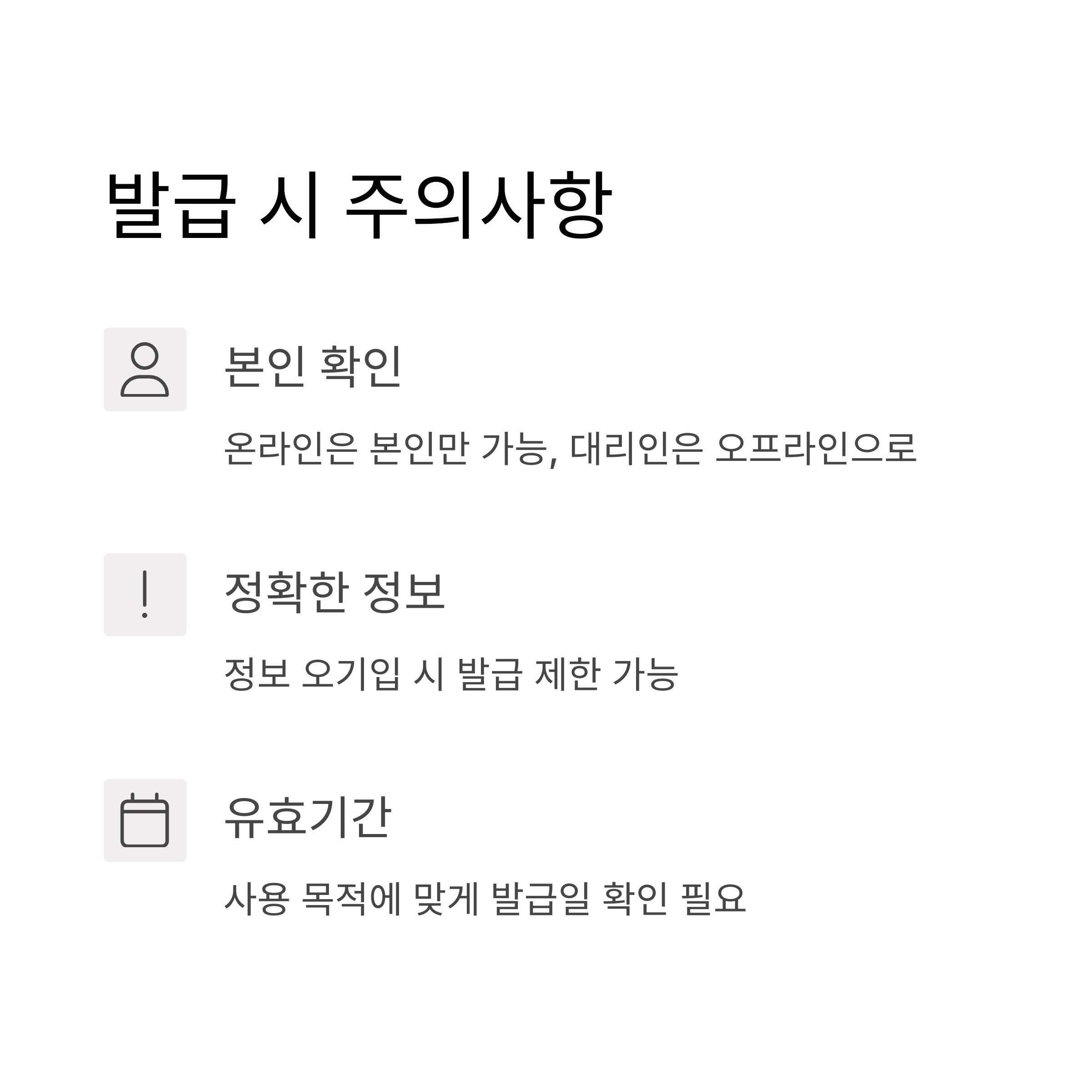 - 증명서 발급 시 정확한 정보를 입력해야 하며, 오기입 시 발급이 제한될 수 있습니다.