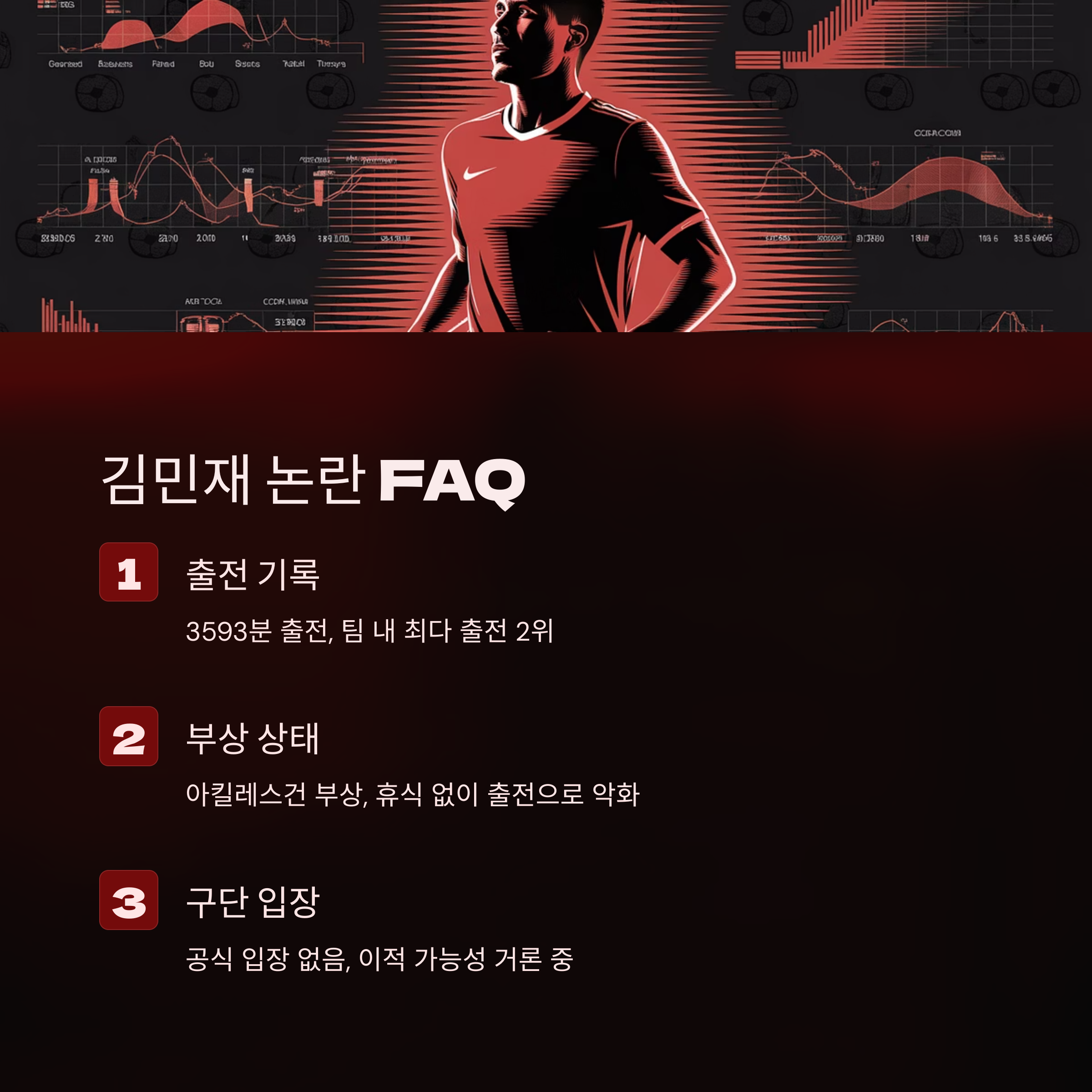 A1. 3593분 출전하며 팀 내 최다 출전 2위를 기록했습니다. - Q2. 김민재의 부상 상태는 어떤가요?