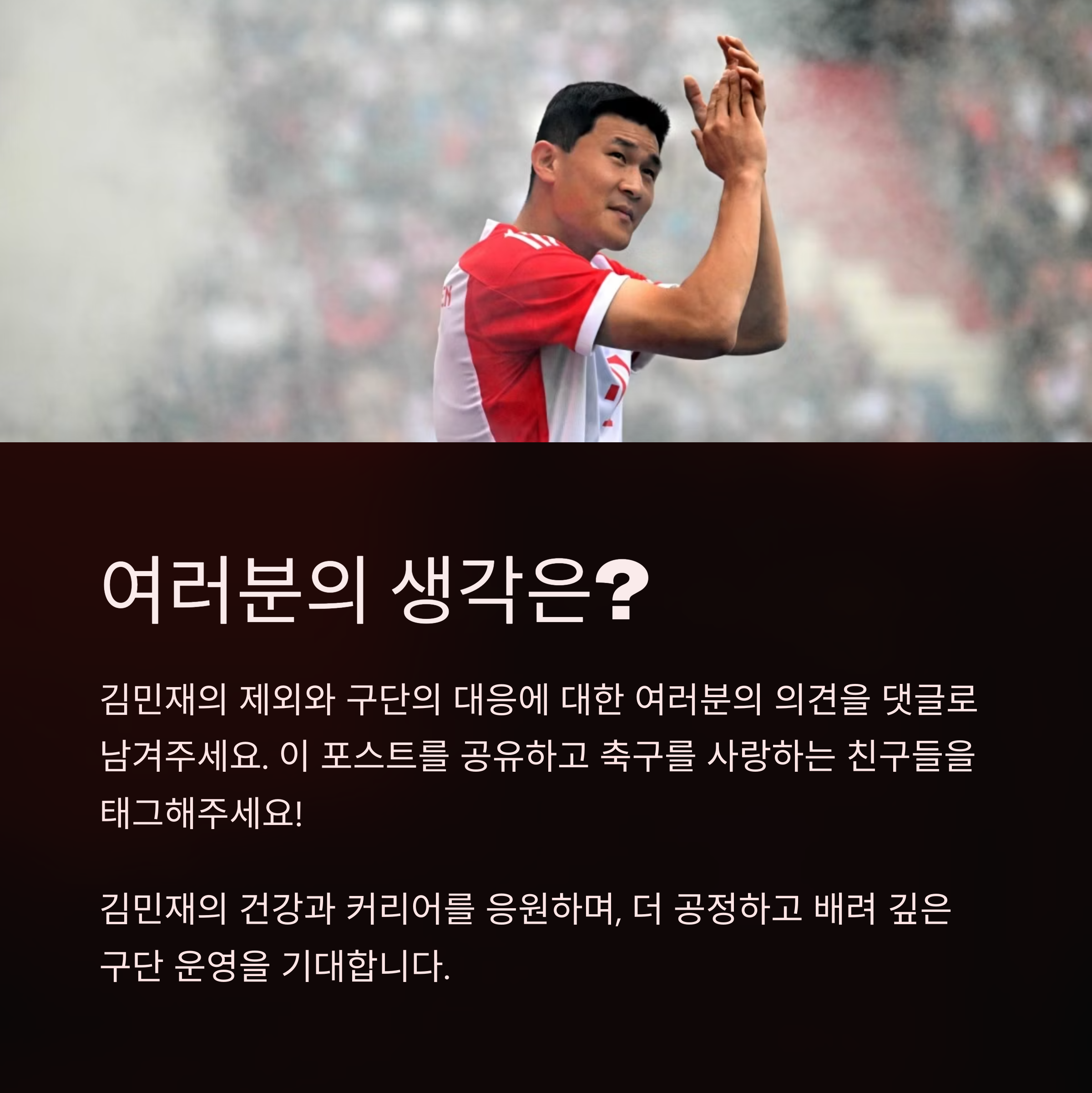 김민재의 제외, 구단의 대응에 대해 여러분의 생각을 댓글로 공유해주세요! 여러분이라면 어떤 메시지를 전하고 싶으신가요?