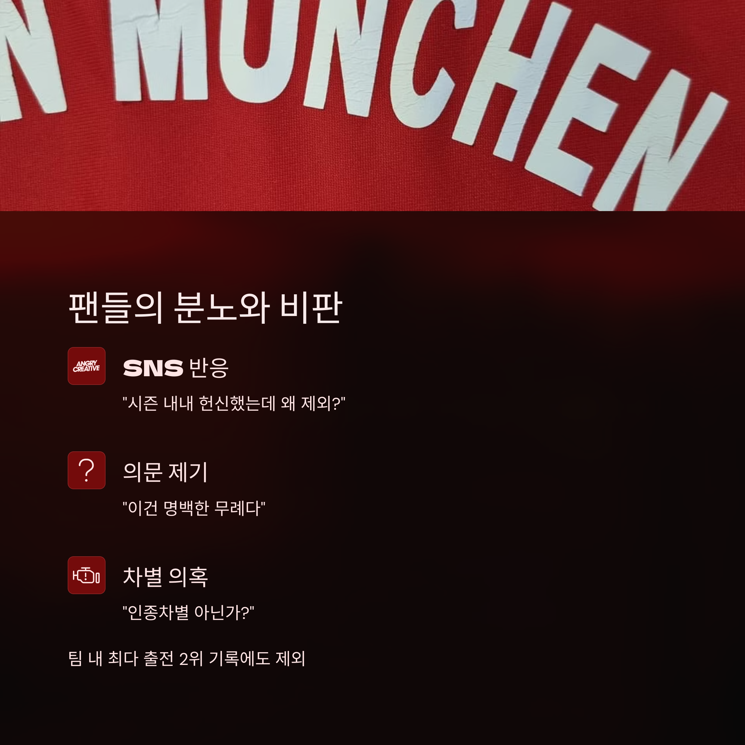 팬들은 SNS와 댓글을 통해 "김민재는 시즌 내내 헌신했는데 왜 제외되었나?", "이건 명백한 무례다", "인종차별 아닌가?" 등의 반응을 보였습니다. 특히, 김민재가 팀 내 최다 출전 2위를 기록했다는 점에서 그의 제외는 더욱 이해하기 어려웠습니다.