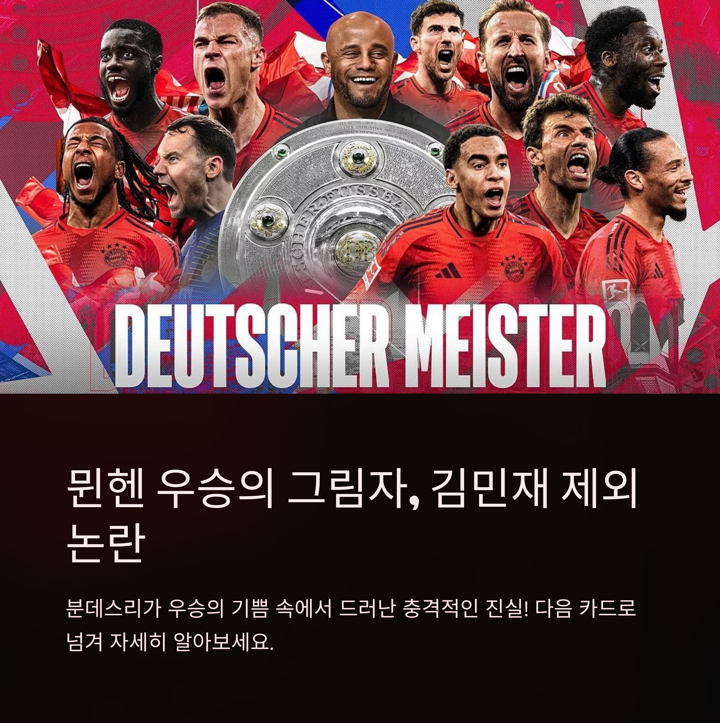 그러나 우승 확정 후 공개된 뮌헨의 공식 유튜브 축하 영상에서 김민재가 제외되면서 논란이 일었습니다. 영상 썸네일에는 해리 케인, 마누엘 노이어 등 주요 선수들이 포함되었지만, 김민재는 빠져 있었습니다. 이는 팬들 사이에서 큰 반발을 일으켰습니다.