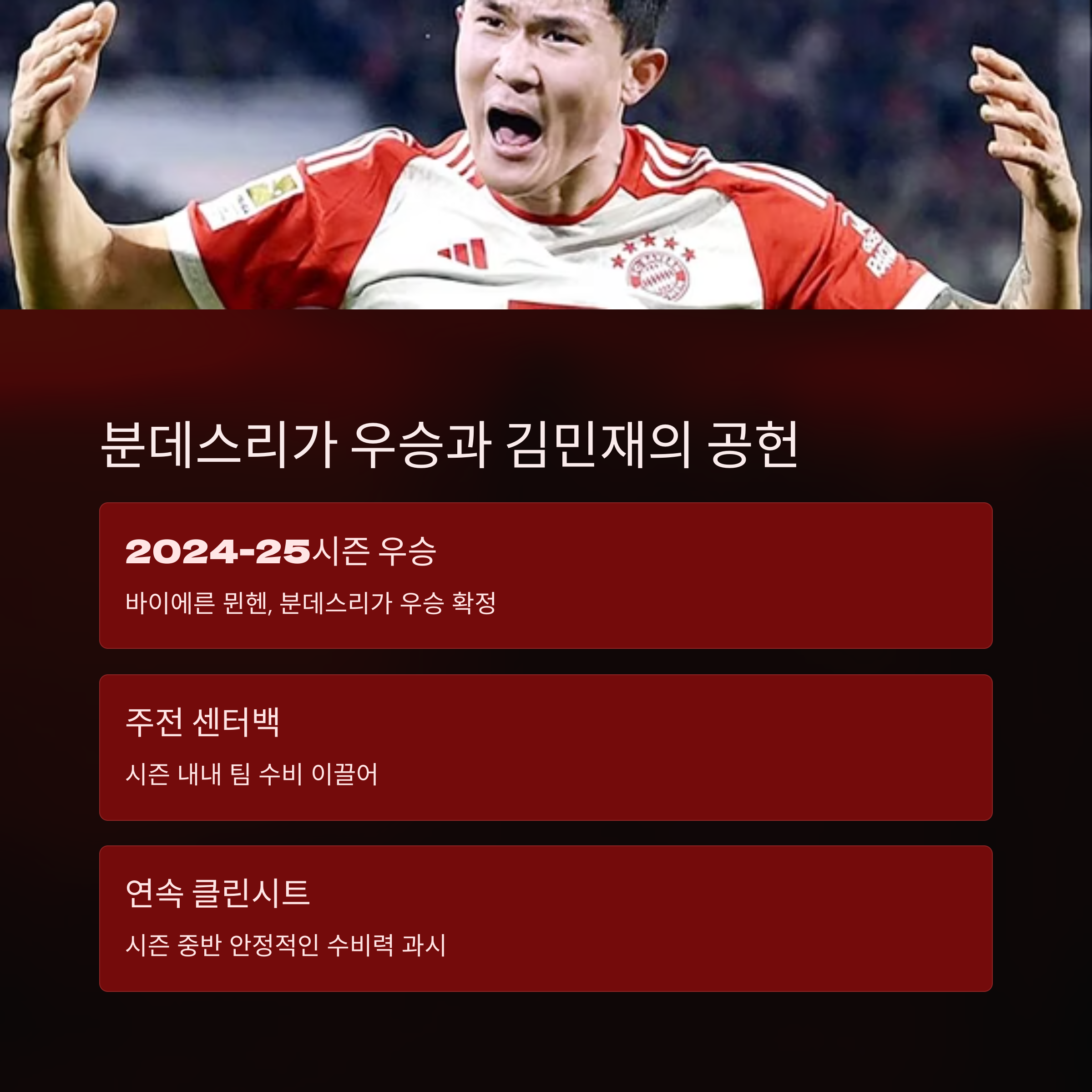 바이에른 뮌헨은 2024-25시즌 분데스리가 우승을 확정 지었습니다. 김민재는 시즌 내내 주전 센터백으로 활약하며 팀의 수비를 이끌었습니다. 특히, 시즌 중반에는 연속 클린시트를 기록하며 안정적인 수비를 보여주었습니다.