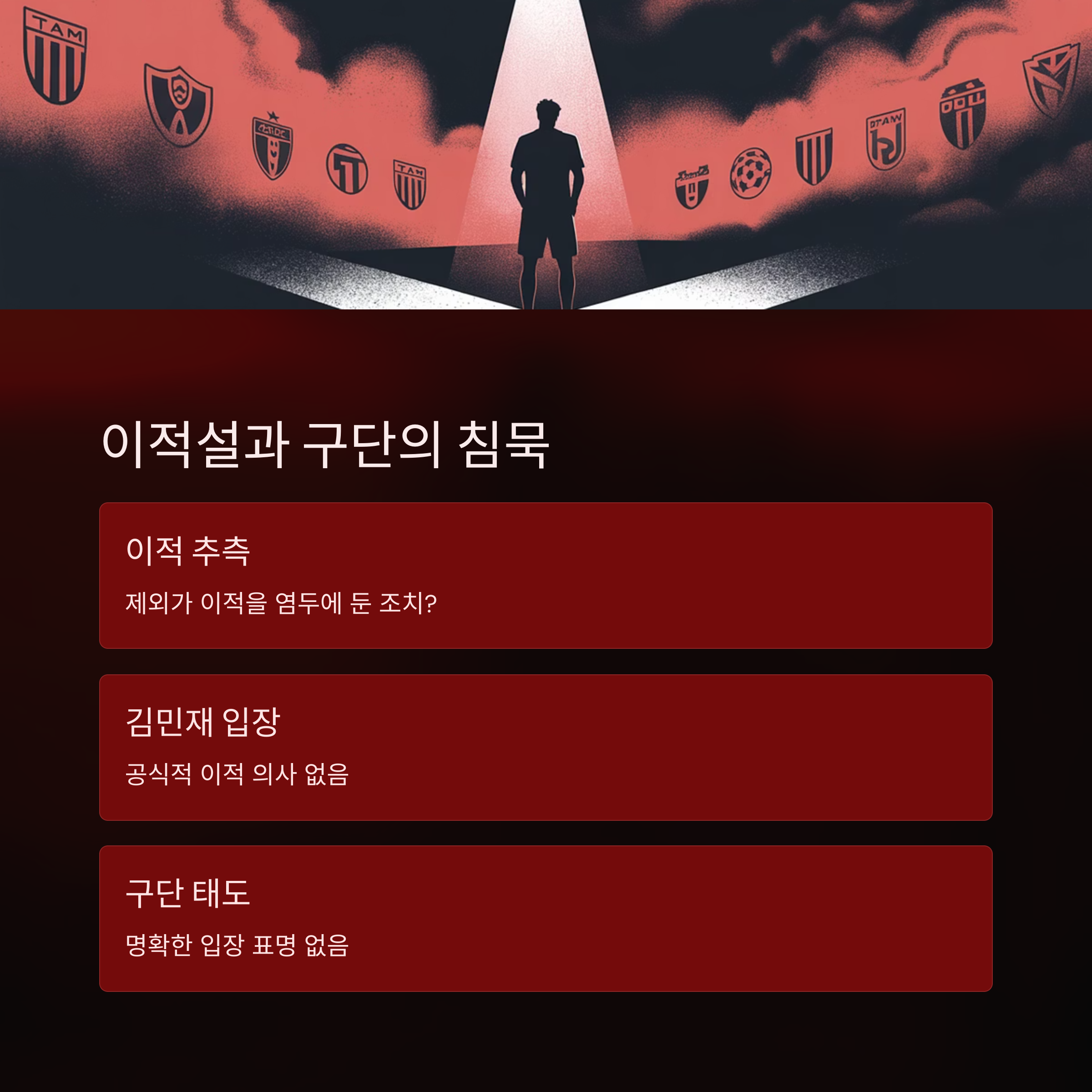 최근 김민재의 이적설이 제기되면서, 구단이 그를 제외한 것이 이적을 염두에 둔 조치라는 추측도 나왔습니다. 그러나 김민재는 공식적으로 이적 의사를 밝히지 않았으며, 구단도 명확한 입장을 내놓지 않았습니다.