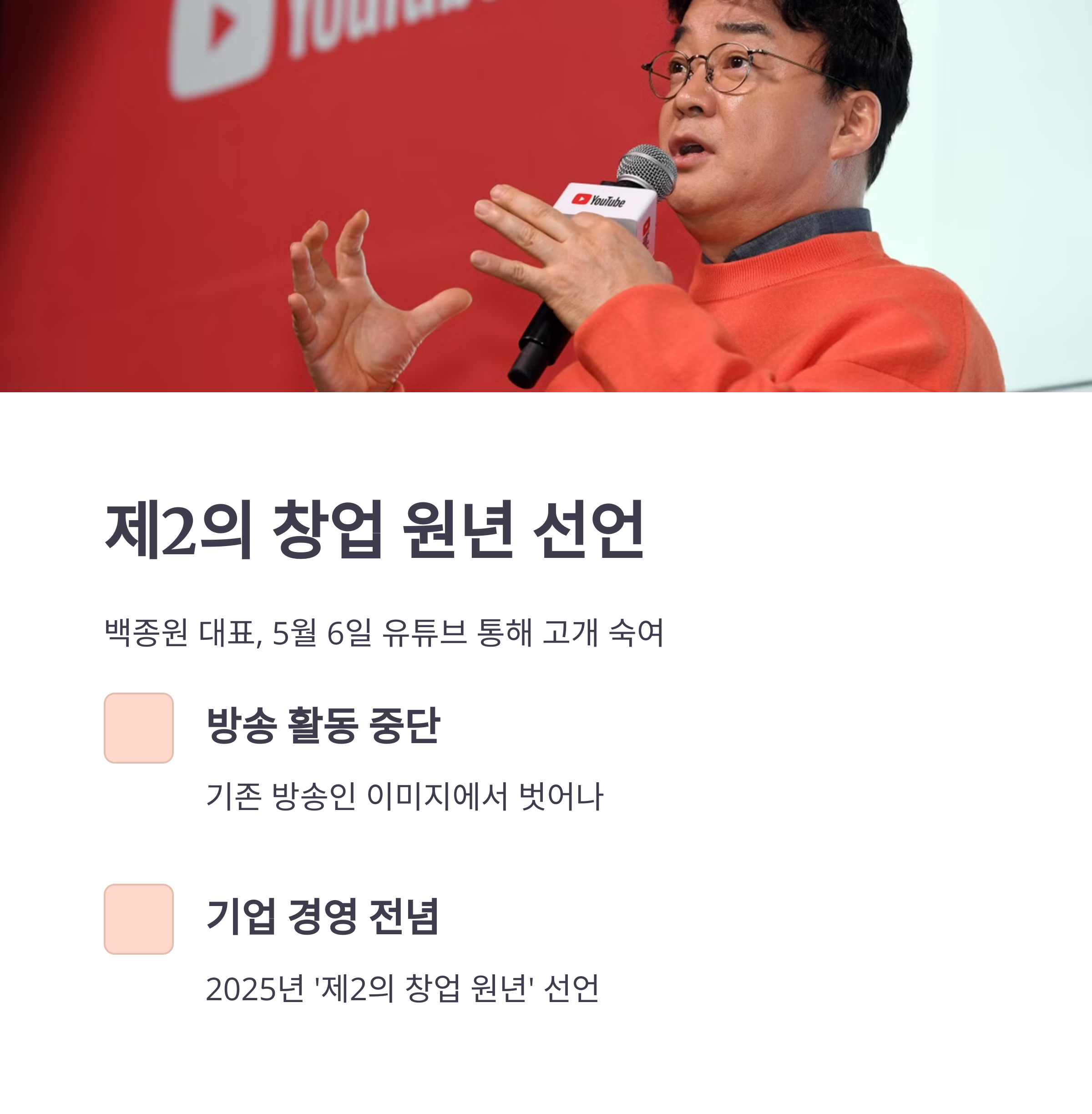2025년을 '제2의 창업 원년'으로 삼겠다는 백종원 대표는 5월 6일 유튜브를 통해 직접 고개를 숙였습니다. 기존 방송 활동에서 물러나고, 본연의 자리인 기업 경영에 전념하겠다는 뜻을 밝혔습니다.