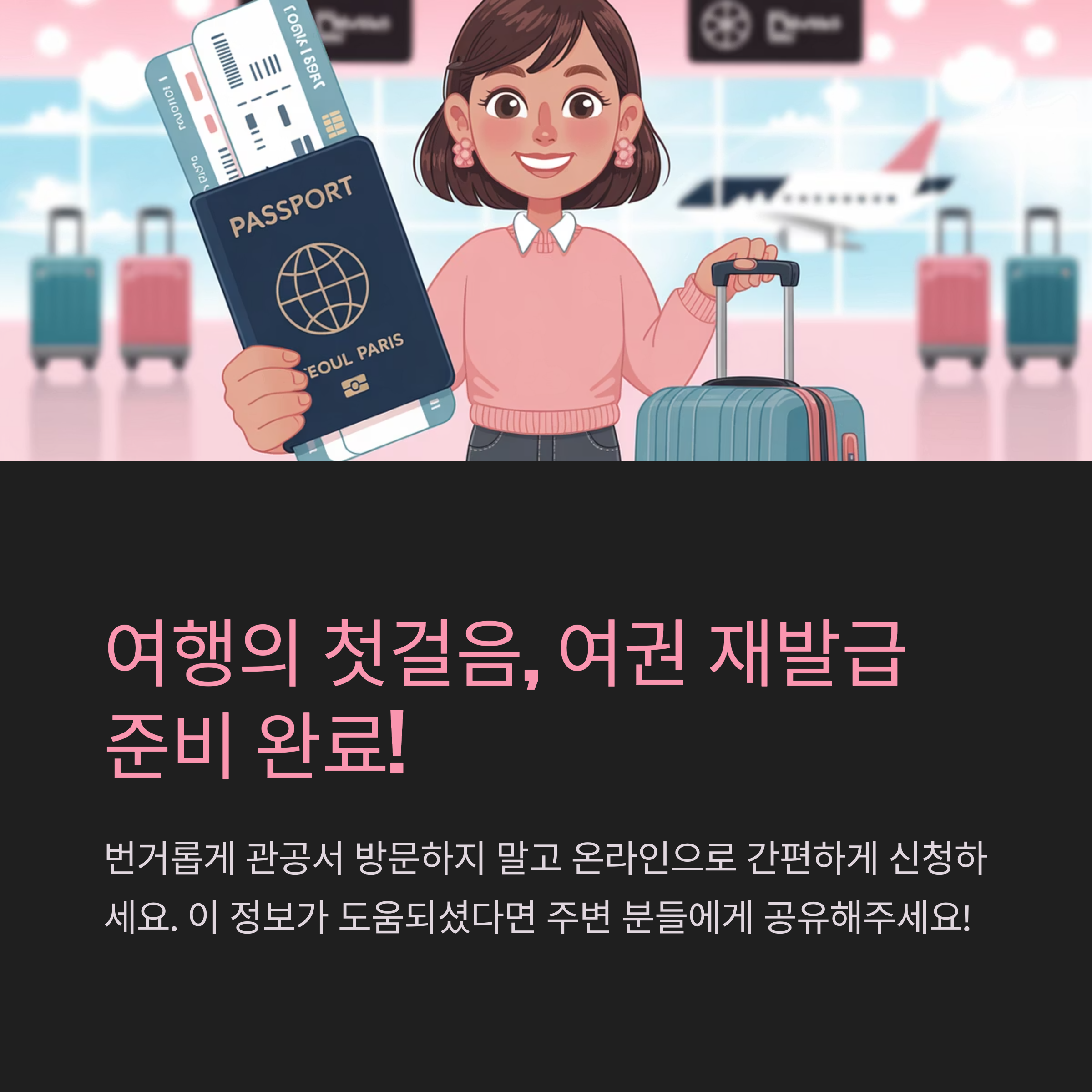 여권 재발급, 이제는 온라인으로 간편하게 신청할 수 있는 시대입니다. 번거롭게 관공서를 방문하지 않고도 집에서 편리하게 신청해보세요. 여행 준비의 첫걸음, 여권 재발급을 손쉽게 해결하시길 바랍니다!