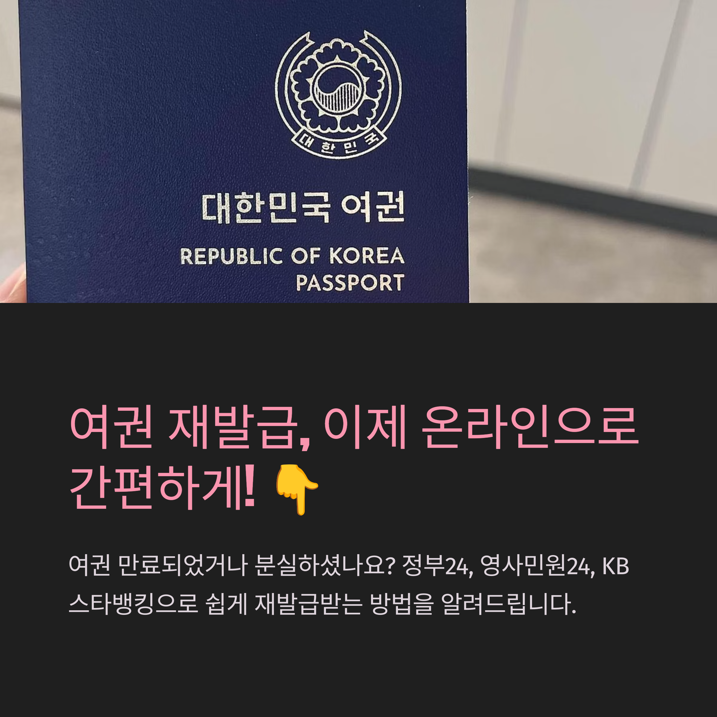 여권 유효기간이 만료되었거나 분실하셨나요? 이제는 온라인으로 손쉽게 여권을 재발급받을 수 있습니다. 정부24, 영사민원24, KB스타뱅킹을 통해 빠르고 간편하게 신청하는 방법을 알려드립니다.