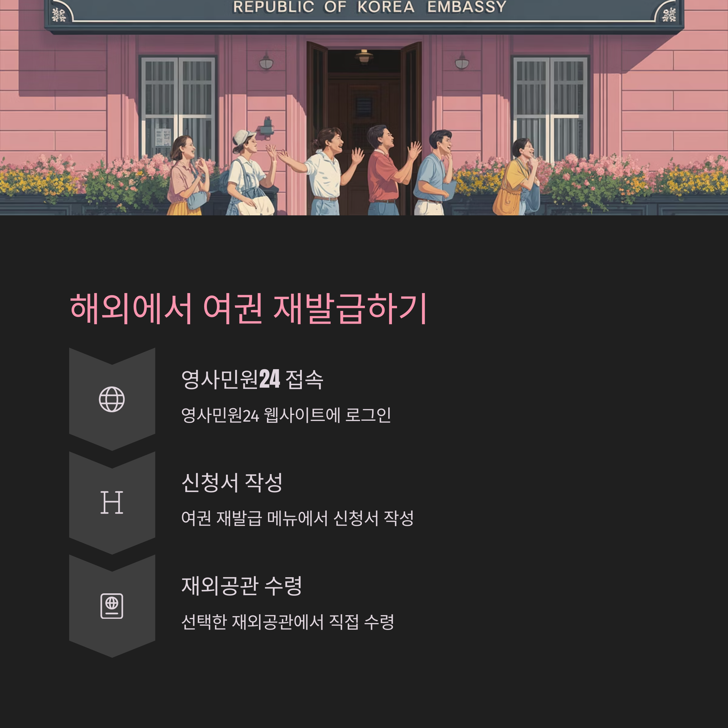 해외에 거주 중인 경우, 영사민원24를 통해 여권 재발급을 신청할 수 있습니다: