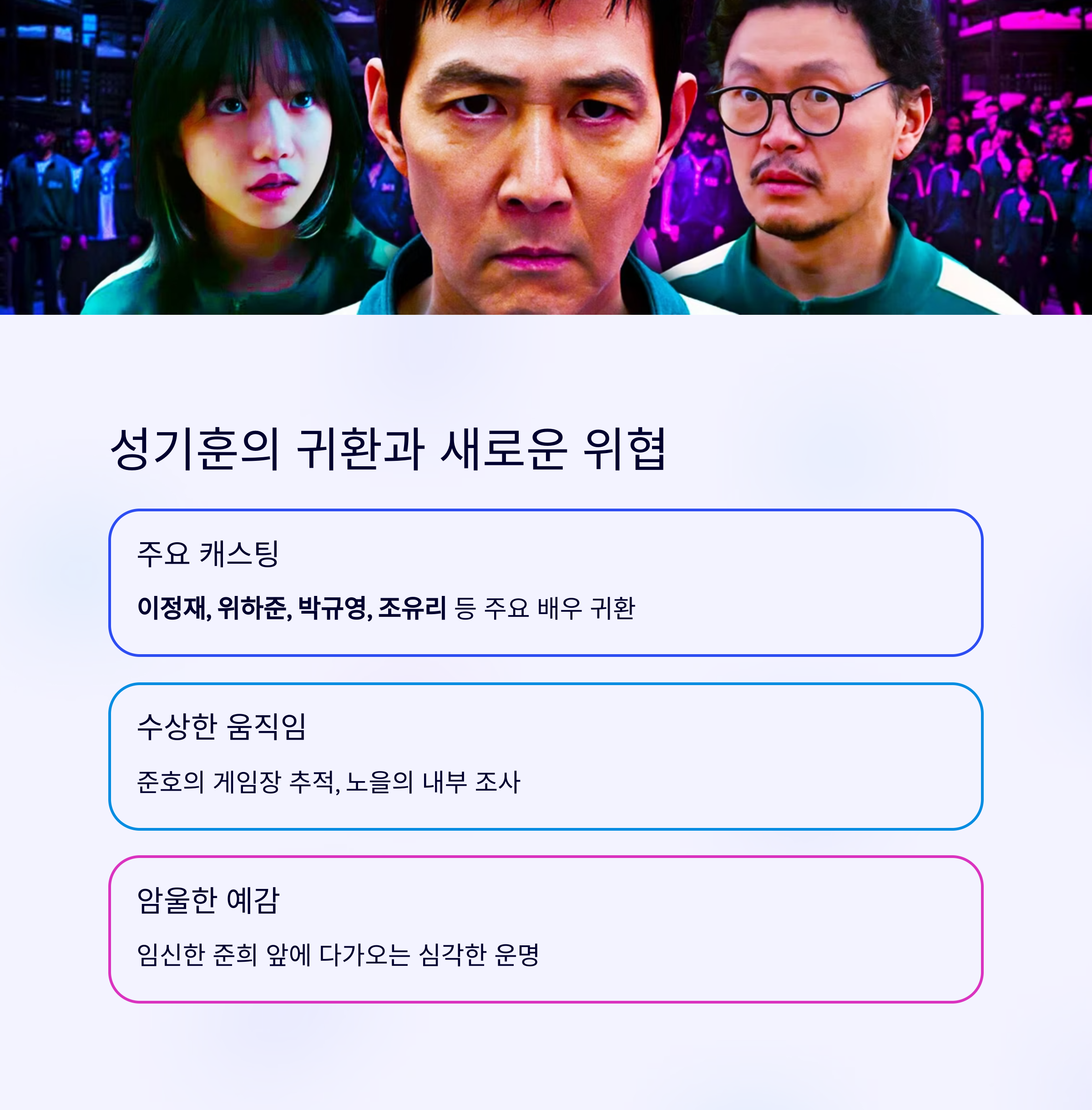 시즌3에서도 이정재(성기훈), 위하준(경찰 준호), 박규영(핑크가드 노을), 조유리(준희) 등 주요 배우들이 그대로 등장합니다. 특히 준호는 여전히 게임장을 추적하고 있으며, 노을은 홀로 내부를 살피는 수상한 움직임을 보입니다.