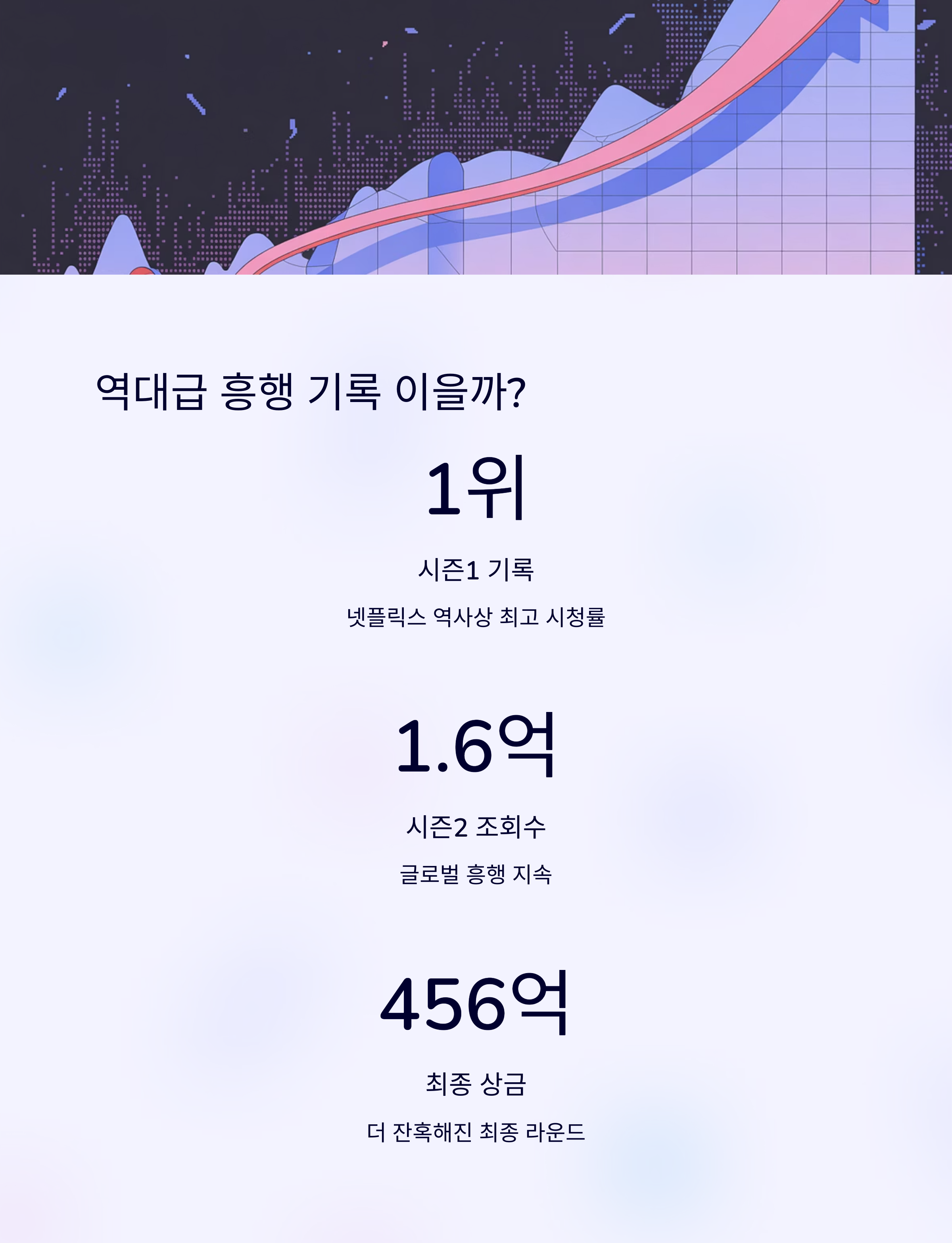 ‘오징어 게임’은 시즌1으로 넷플릭스 역사상 최고 시청률을 기록했으며, 시즌2 또한 1억 6천만 회 이상의 조회수를 기록하며 글로벌 흥행을 이어갔습니다.