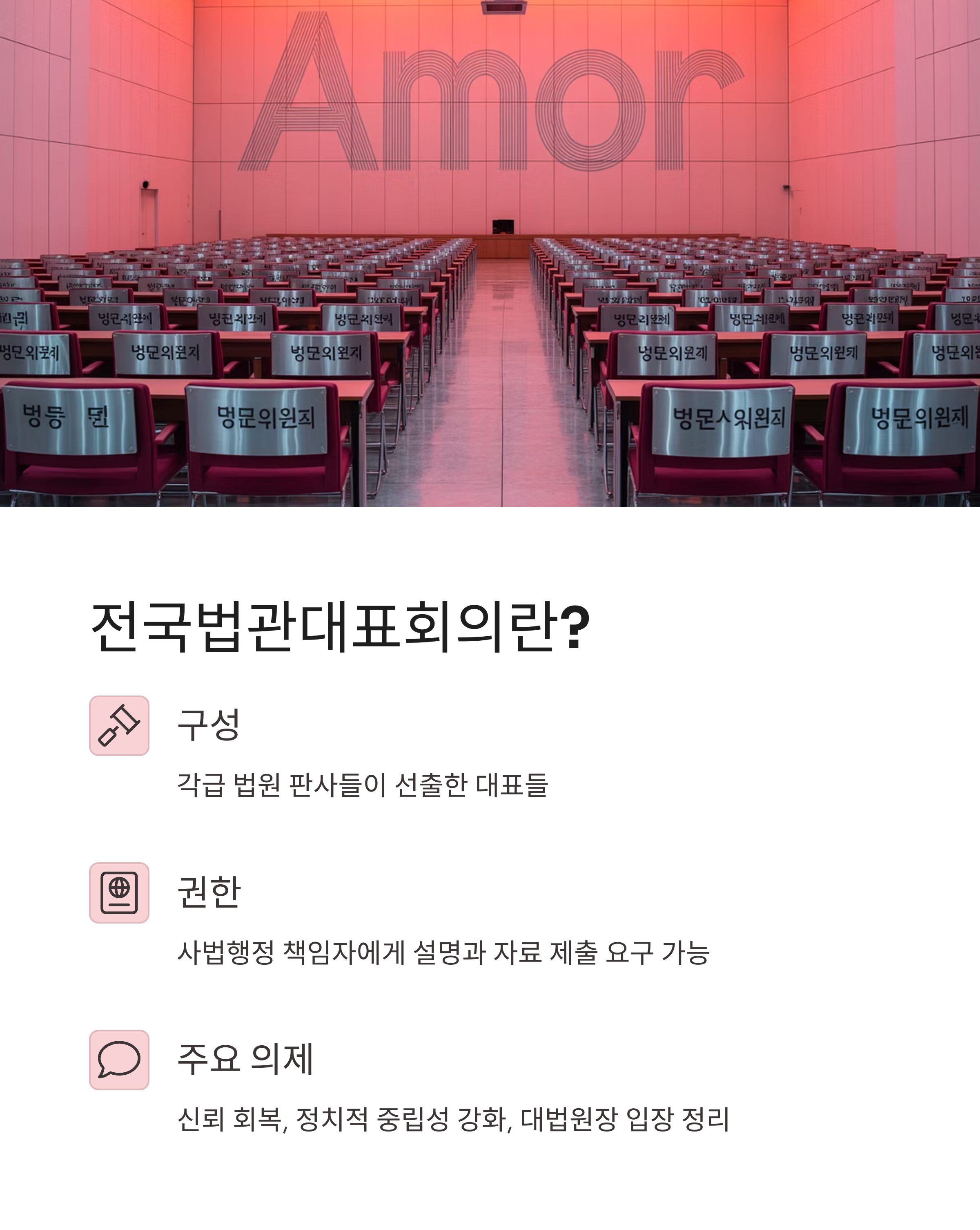 전국법관대표회의는 사법행정에 대한 의견을 표명하고, 법관 독립성을 위한 제안을 공식화하는 사법부 내 최고 의결기구 중 하나입니다.