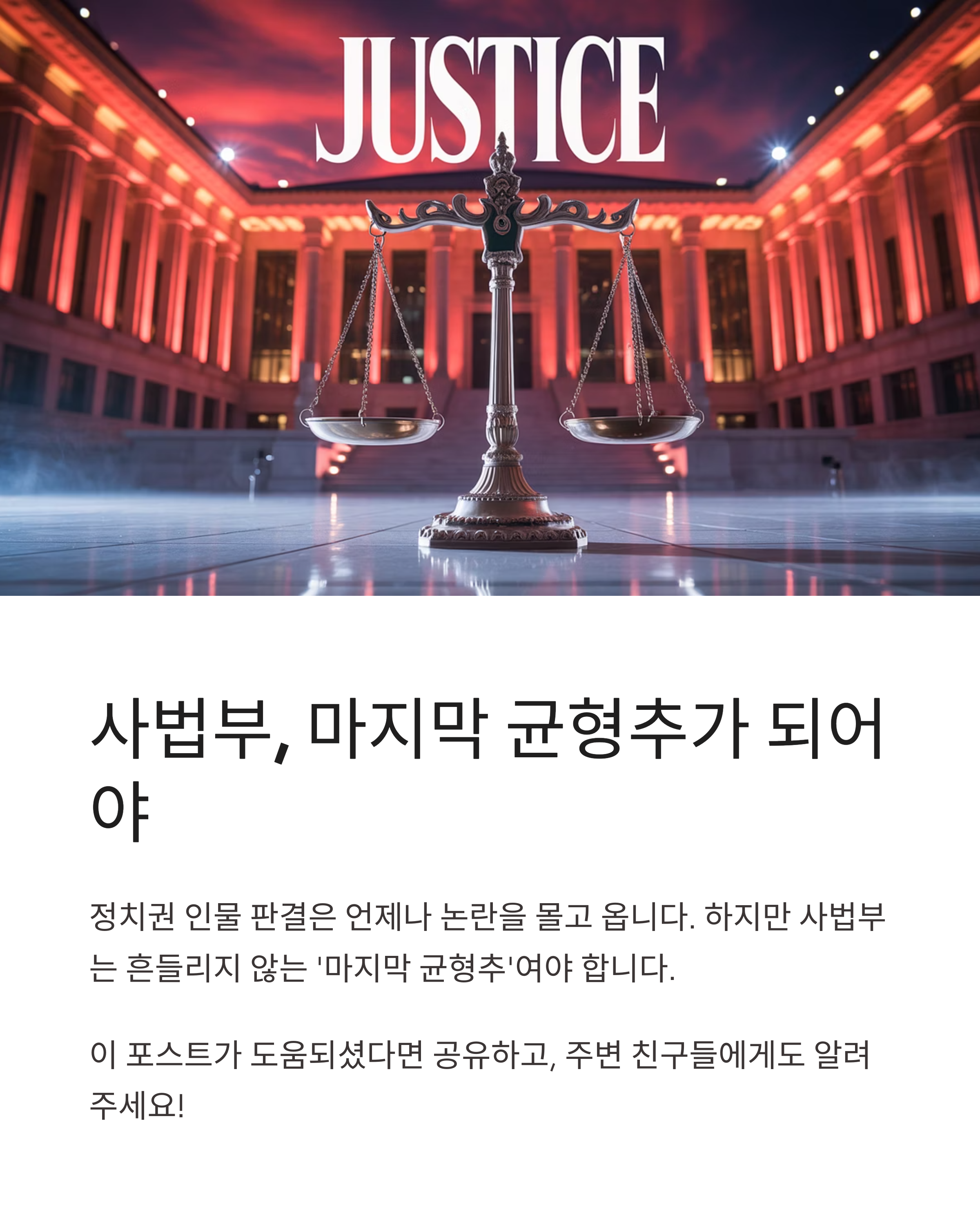 정치권의 큰 인물에 대한 판결은 언제나 논란을 몰고 옵니다. 하지만 사법부는 논란 속에서도 흔들리지 않는 ‘마지막 균형추’여야 합니다. 이번 회의는 사법부가 그 본래의 무게 중심을 되찾는 계기가 될 수 있을까요?
